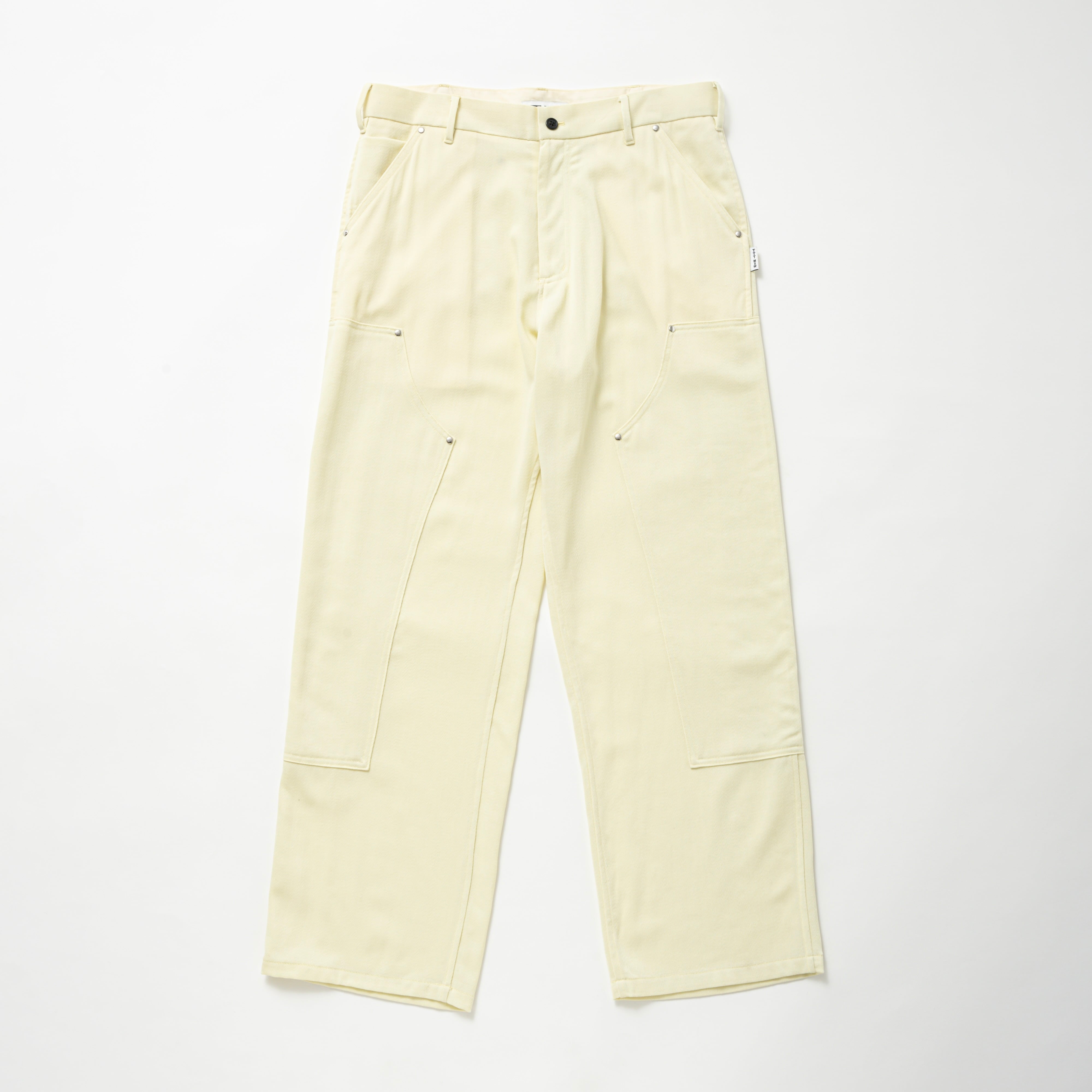 光沢のあるカルゼ素材にオイルカットしたような手触り感を出す樹脂加工を施し、ドライタッチな風合いや適度な反発感、ナチュラルなストレッチ性を併せ持った風合いが特徴。ダブルニーパンツとは、パンツの膝部分に当て生地が施され、二重に補強されたワークパンツの一種だが、カジュアルな印象ではなく、綺麗めに落とし込んだ1本。