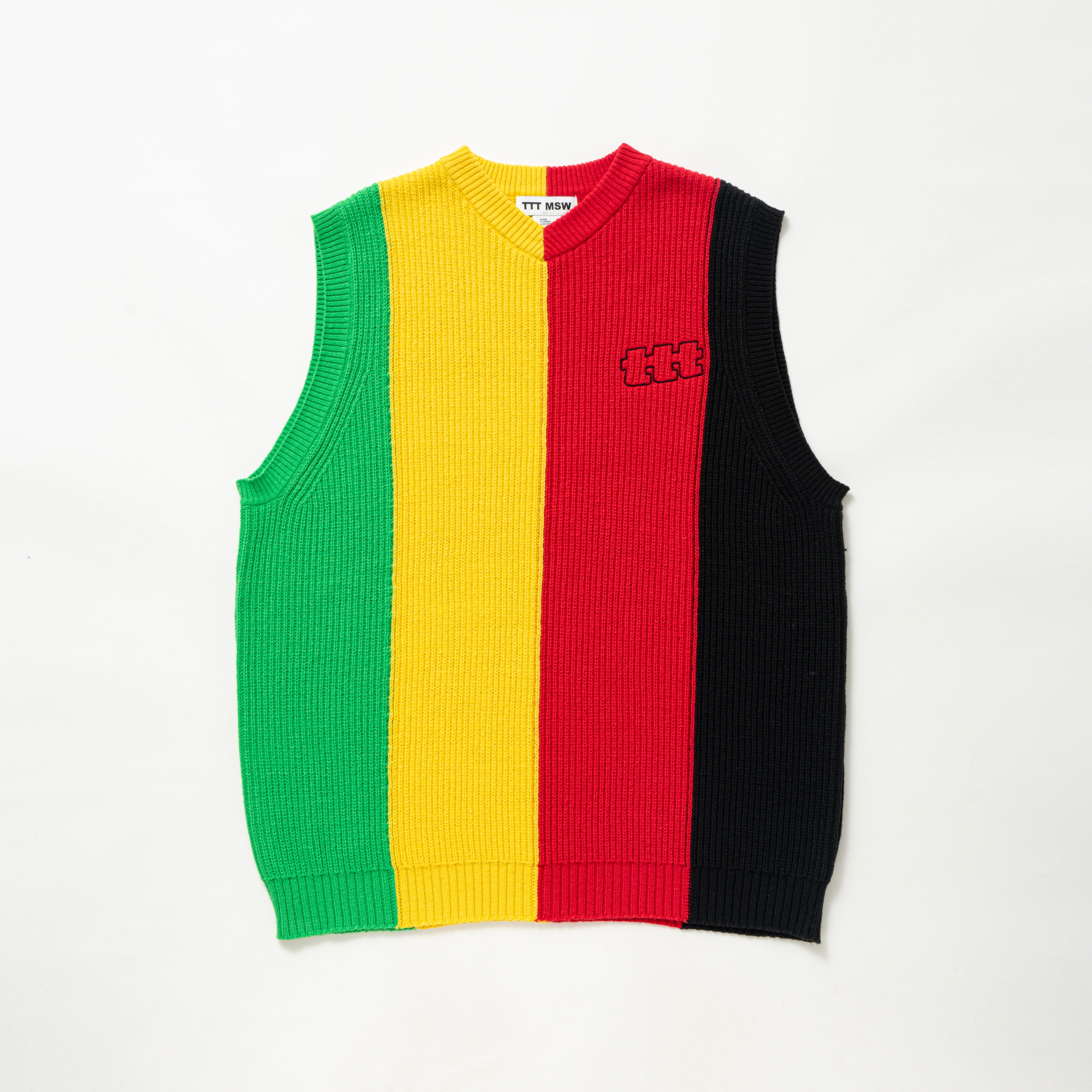 定番シリーズのニットベスト。アフリカに由来するラスタカラーを採用。デザイナー玉田が各国で出会った、友人たちの出身国の国旗がデザインベースとなっている。