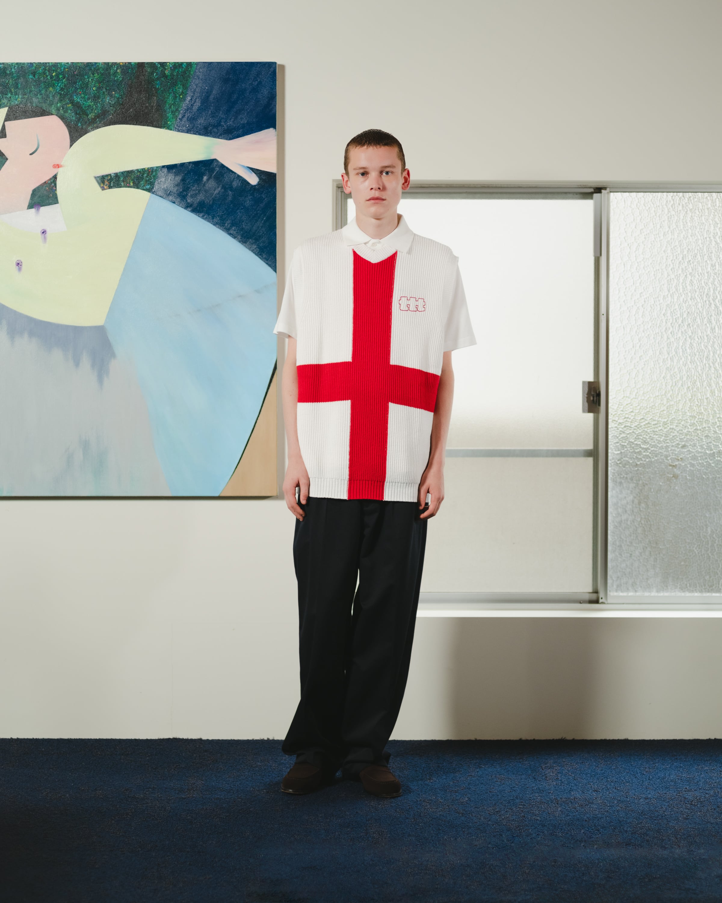 定番シリーズのニットベスト。イングランドの国旗カラーを採用。デザイナー玉田が各国で出会った、友人たちの出身国の国旗がデザインベースとなっている。