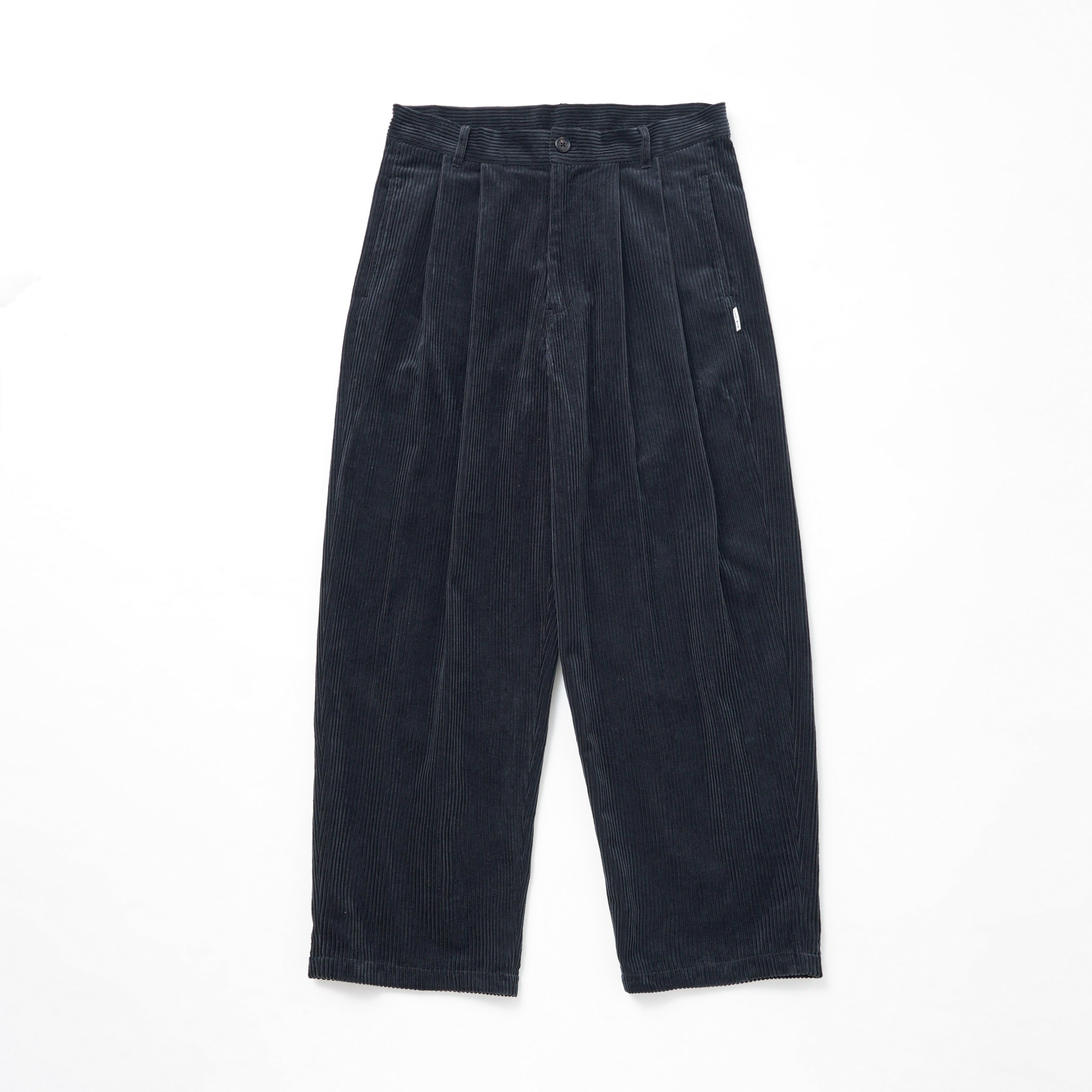 太畝のコーデュロイ生地を使用。凹凸がしっかりとして存在感ある表情の生地がポイント。独特の光沢感と程よい起毛感があり、ゆとりのあるヒップラインから裾にかけて、ゆるやかなテーパードシルエットに。