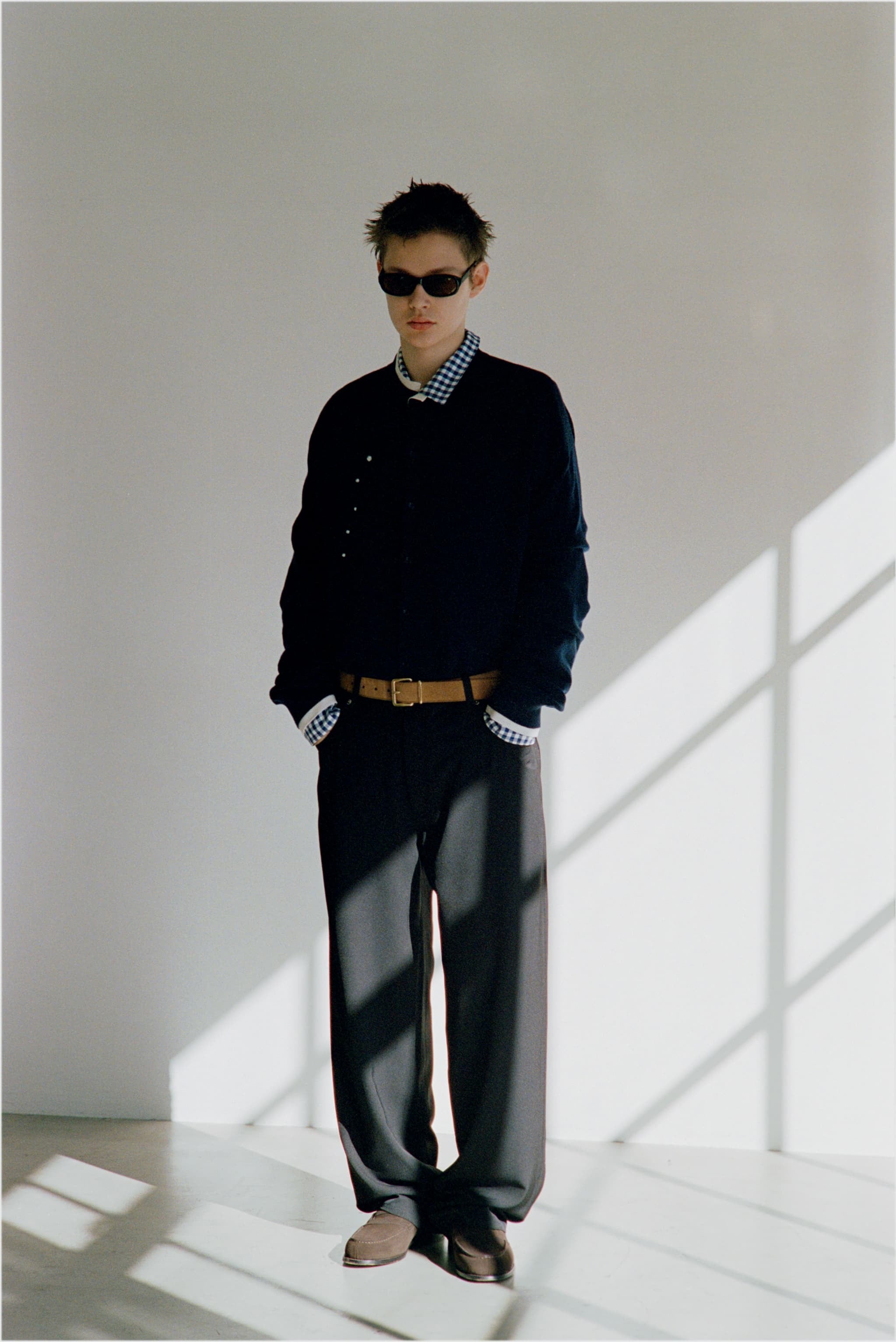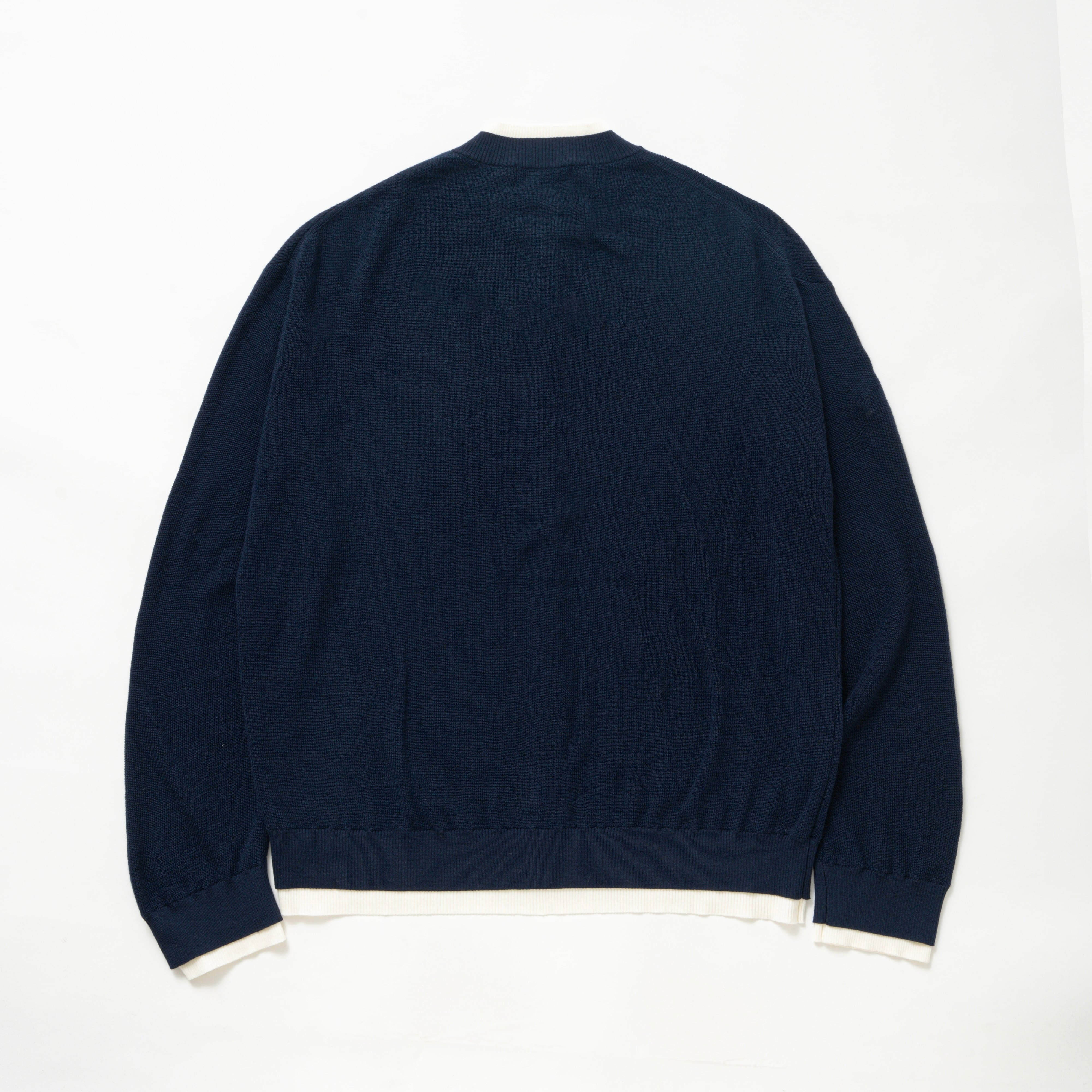 スーパーファインメリノウールを原料に使用した糸。2/60の細番の糸を16GGのハイゲージで編むことで編み目が非常に細かくなるので、柔らかな肌触りと細番ウール特有の光沢感もある着心地の良いニットに仕上げている。