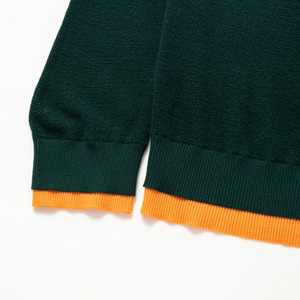 スーパーファインメリノウールを原料に使用した糸。2/60の細番の糸を16GGのハイゲージで編むことで編み目が非常に細かくなるので、柔らかな肌触りと細番ウール特有の光沢感もある着心地の良いニットに仕上げている。