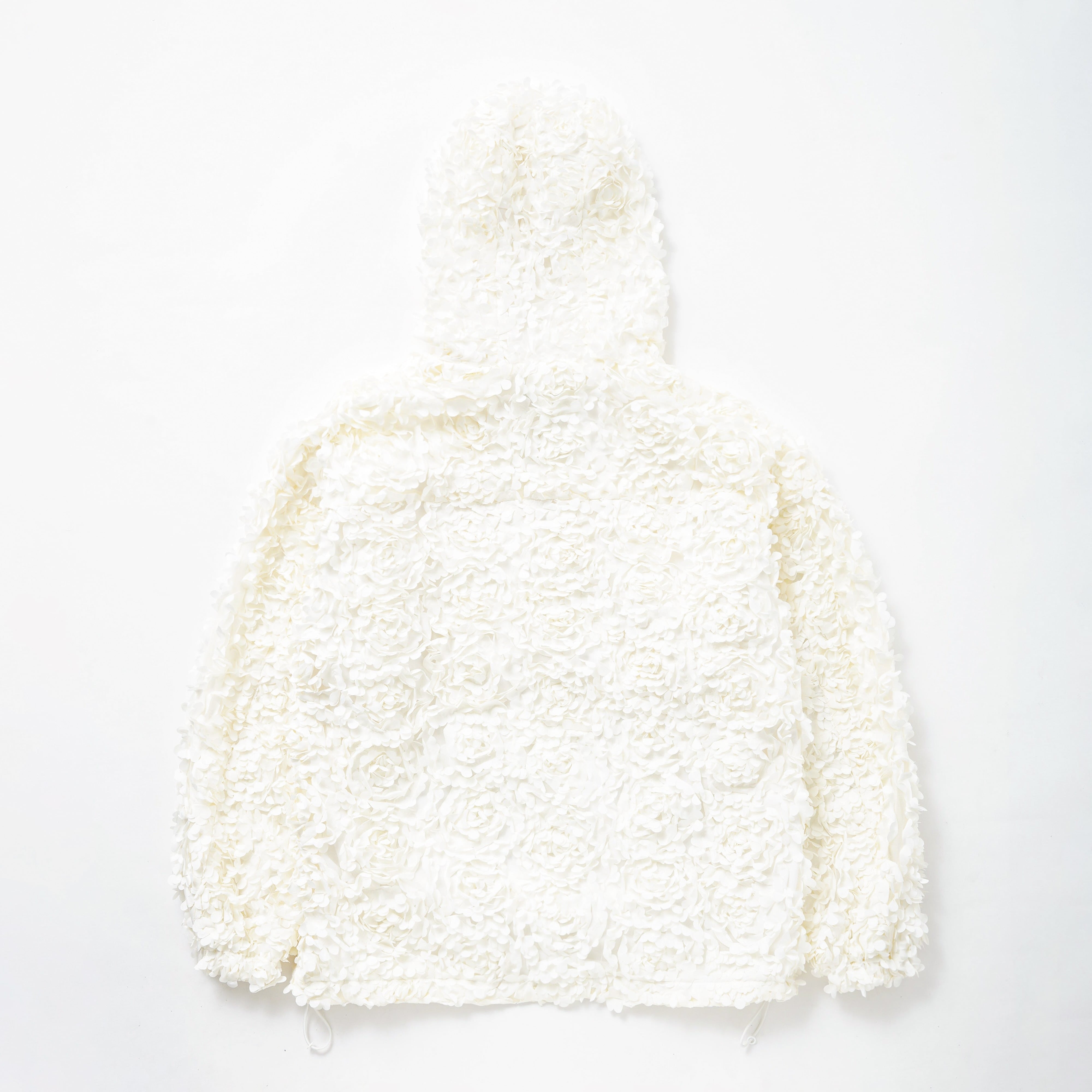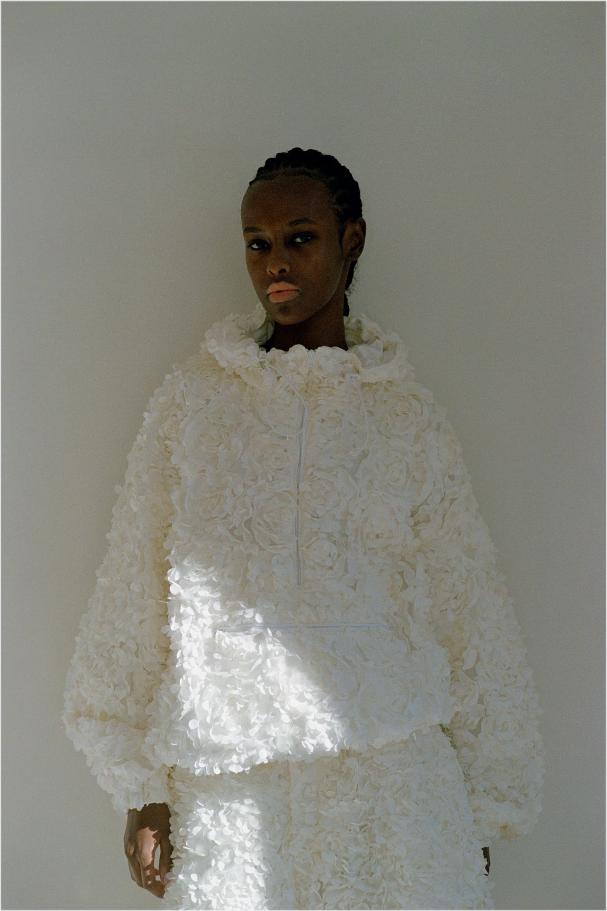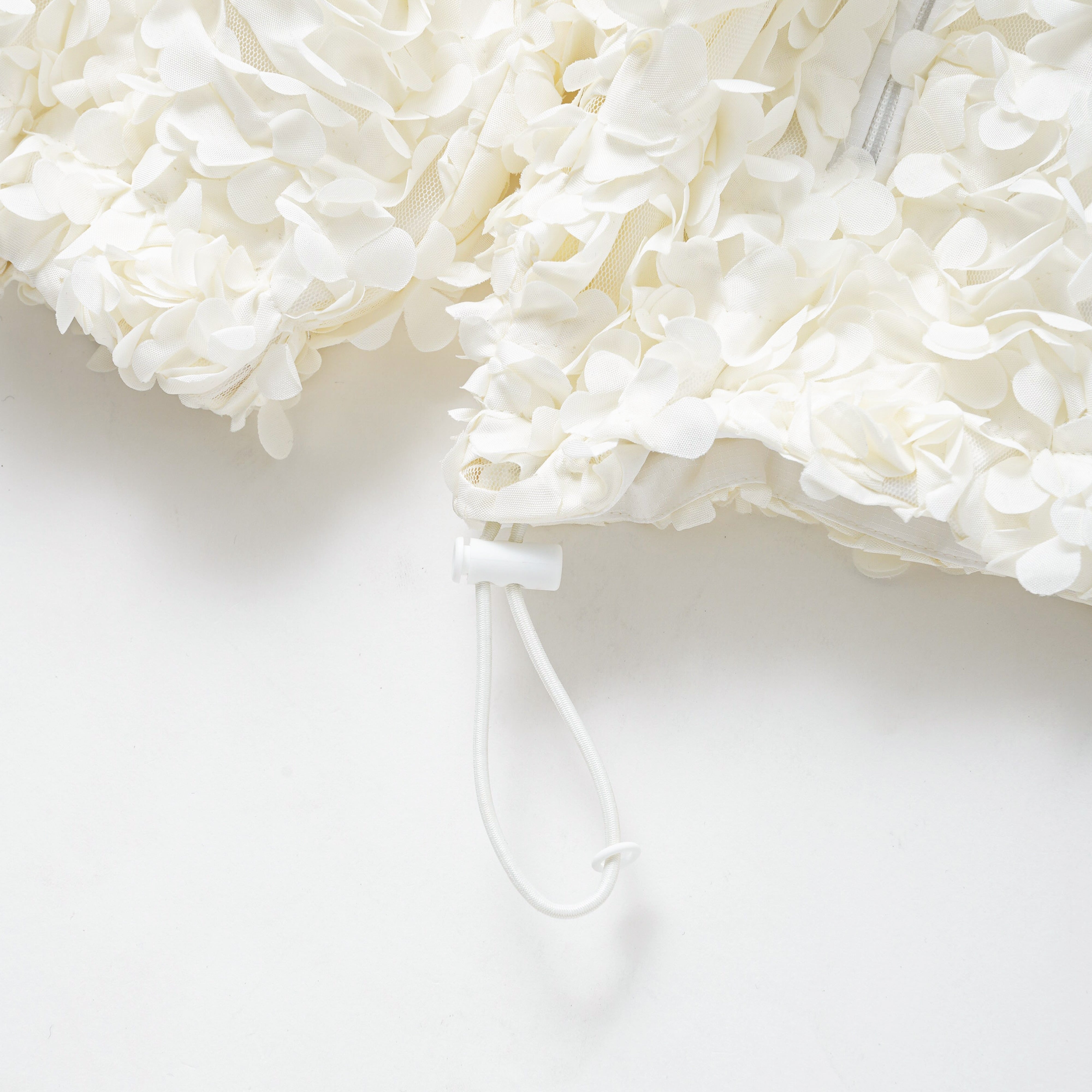 1950年にイタリアのプラトー地区で創業した、70年以上の歴史を持つ生地メーカー「CAFISSI社」の生地を使用。モダンなデザインにカットされたファブリックをチュールに縫い付けたニット素材。