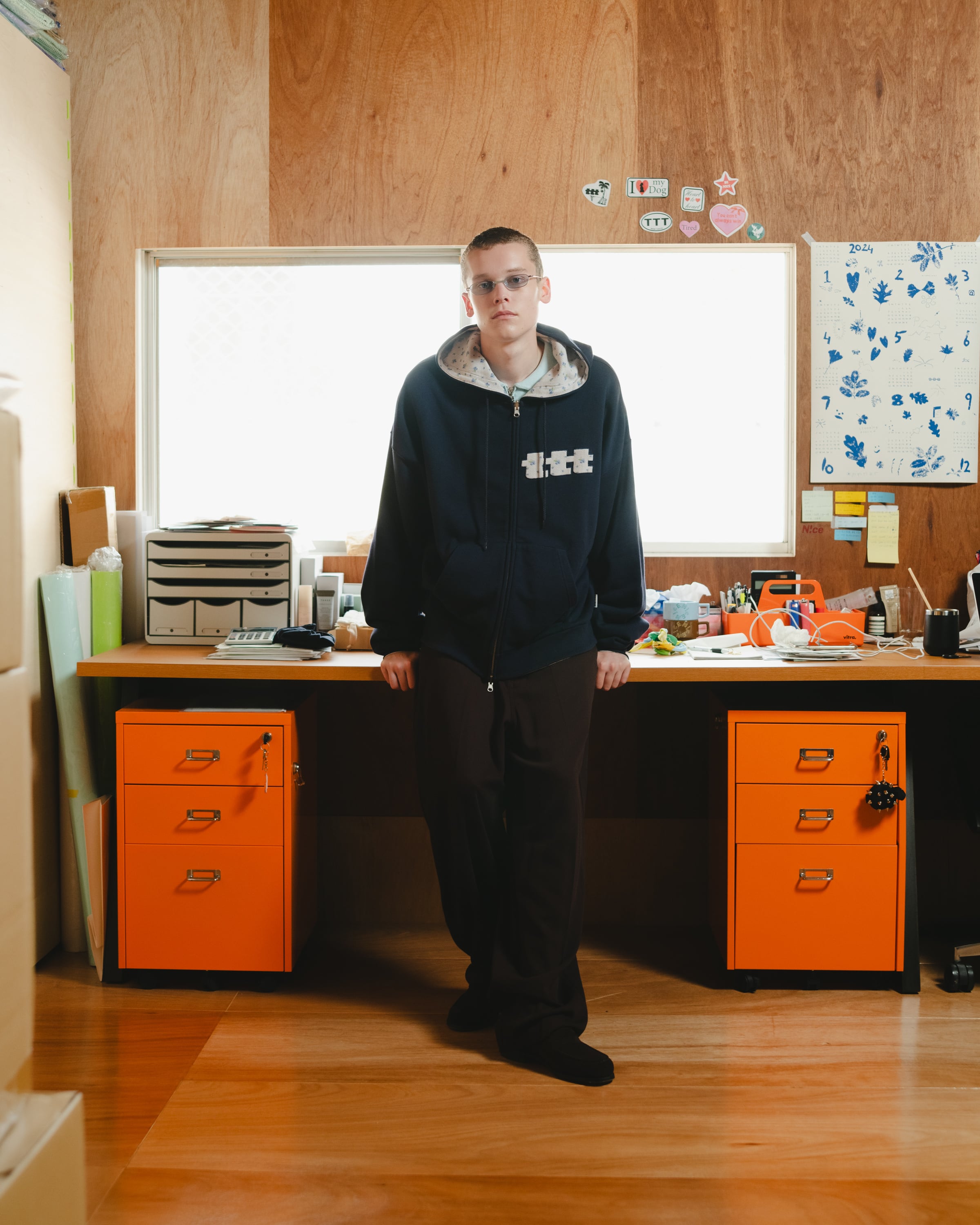 定番のtttロゴフーディーをリバーシブル仕様にアップデートしたアイテム。リバーシブル生地には、ブルーベリー柄のサーマル生地を使用。