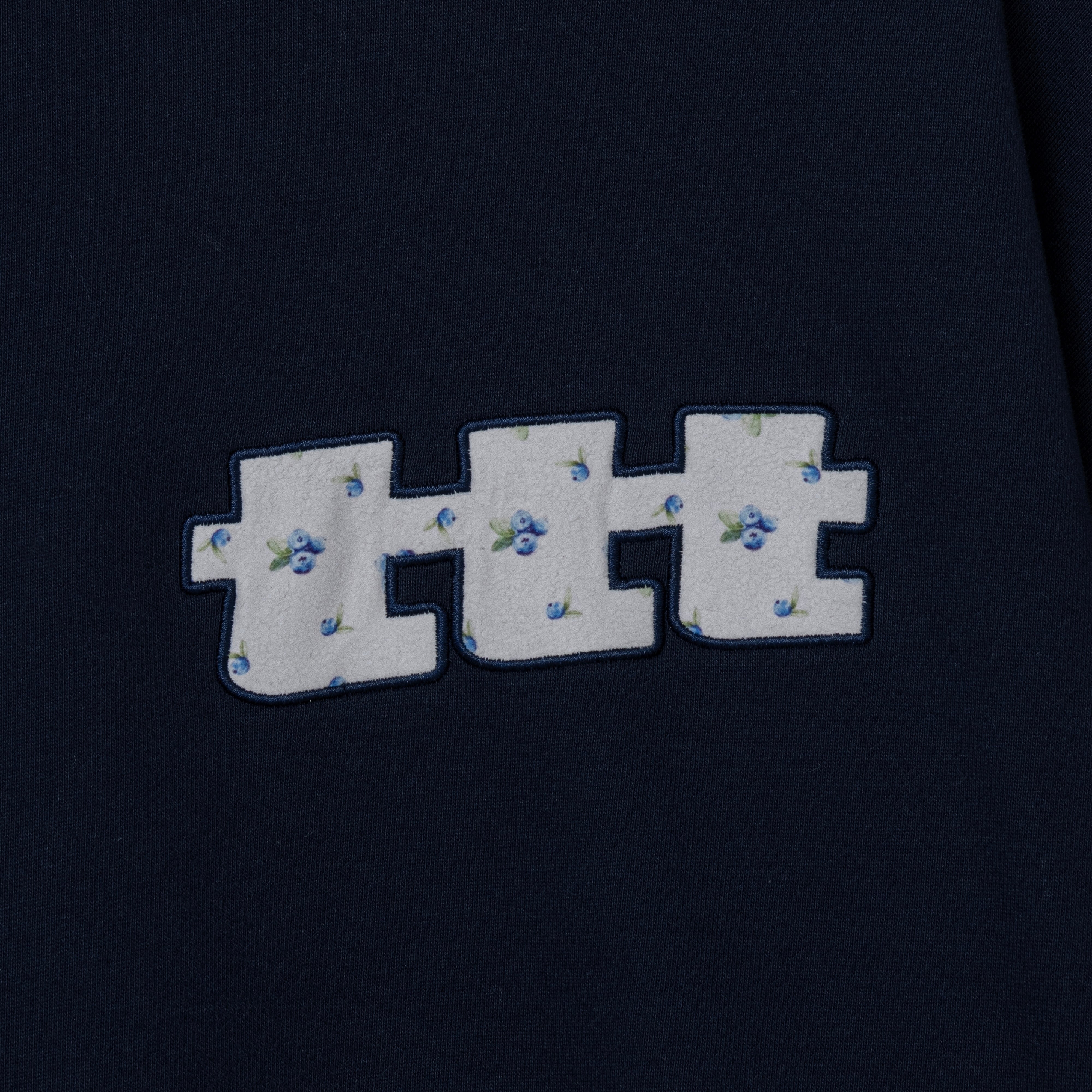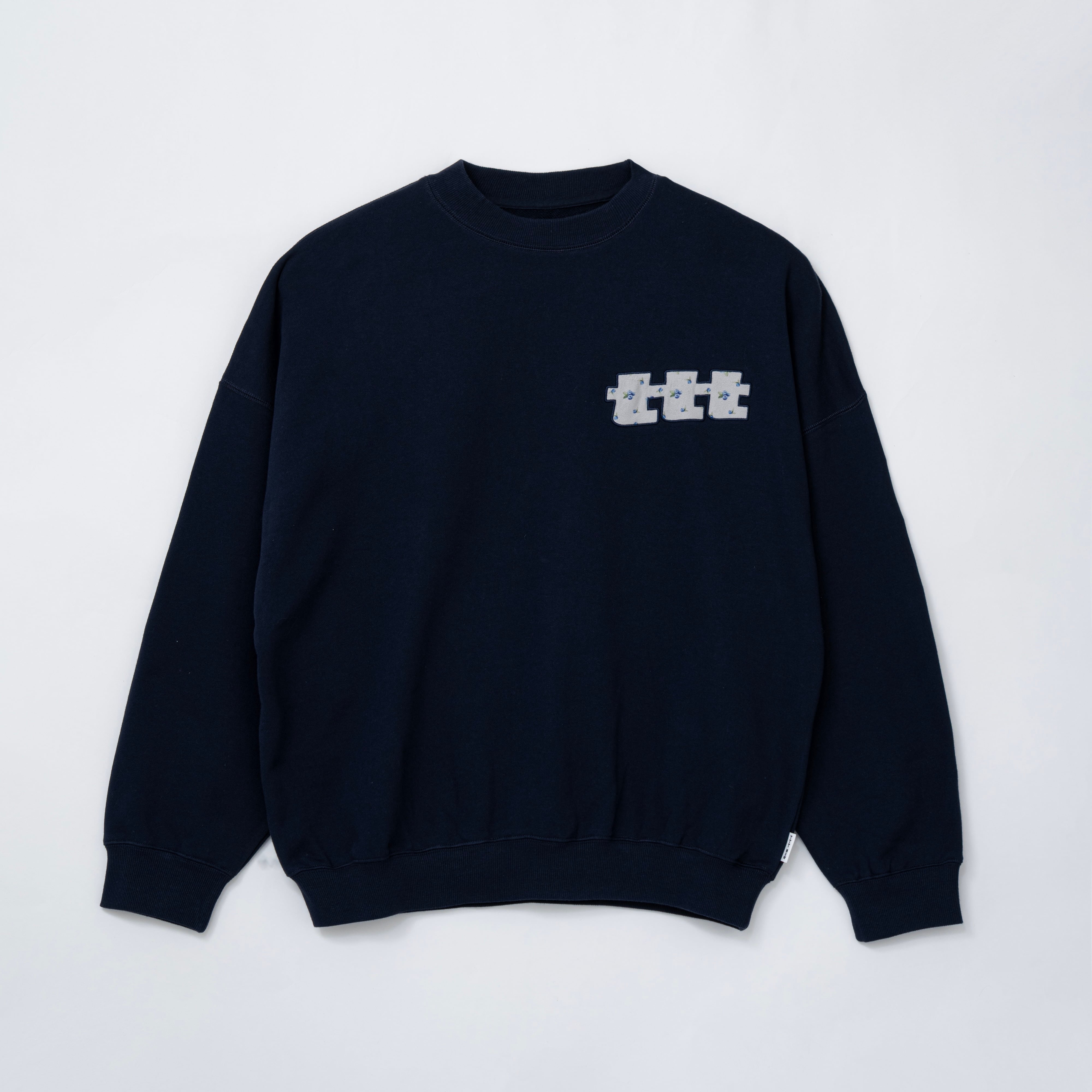 定番のtttロゴスウェット。胸元のロゴにはブルーベリー柄のサーマル生地を使用。