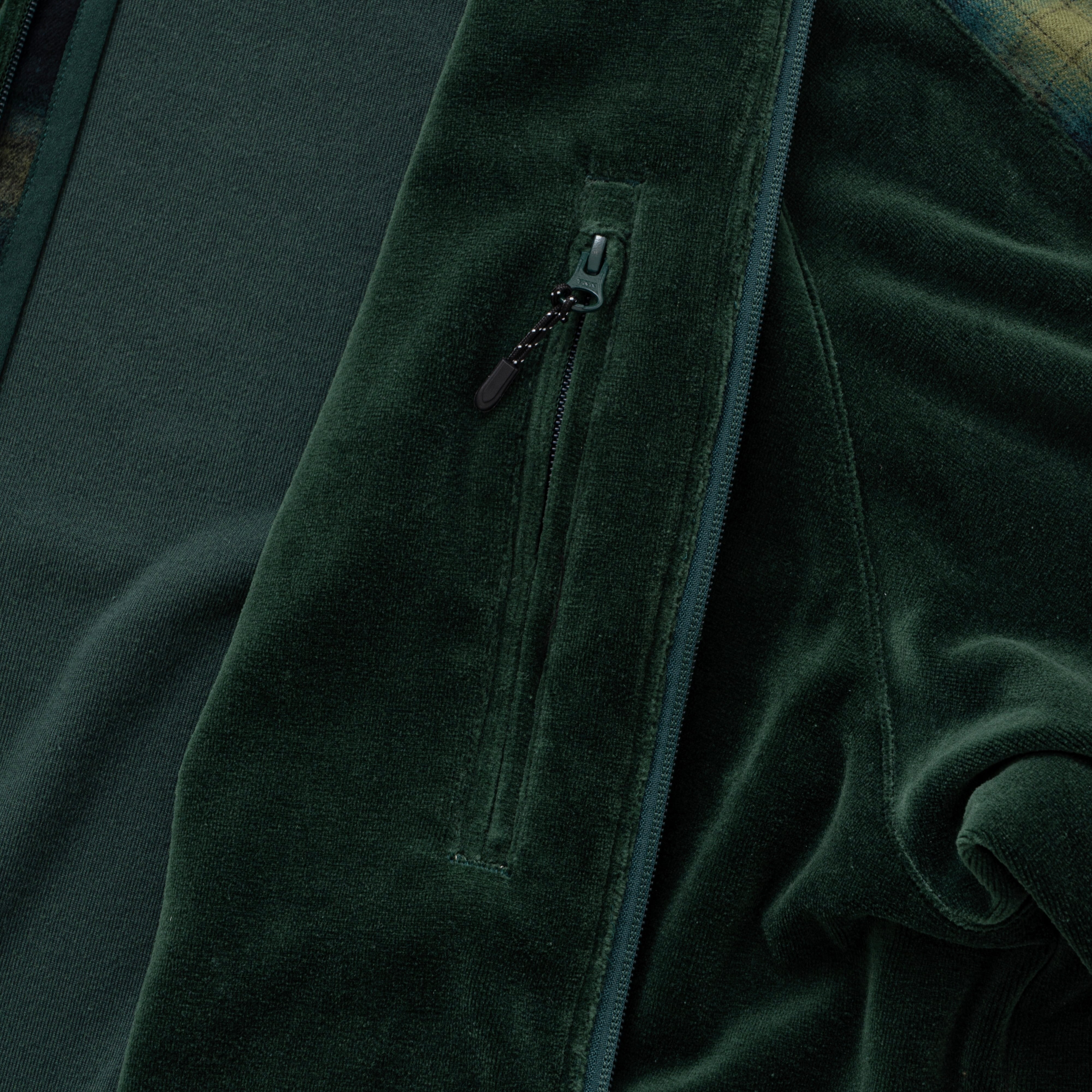厚手でしっかりとした質感を持つヘビーベロアを採用。柔らかく滑らかな肌触りと独特の光沢感が特徴。切替部分は厚手の綿100コットンネル素材を使用。ジャケット左胸と左胸内部にポケットあり。ポケット内部は熱が篭らないよう、メッシュ素材を使用しているのもポイント。裾はドローコードにて調整可能。
