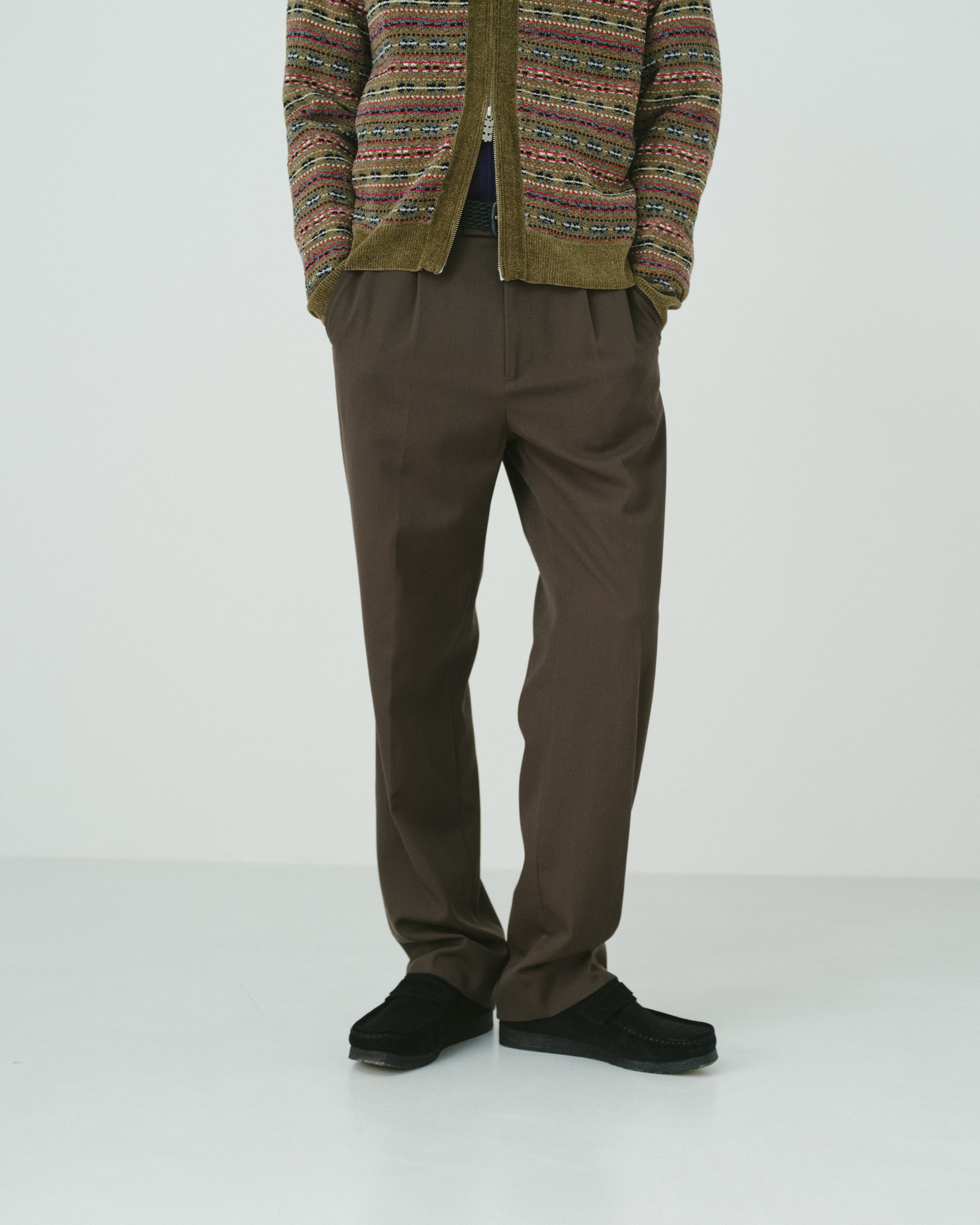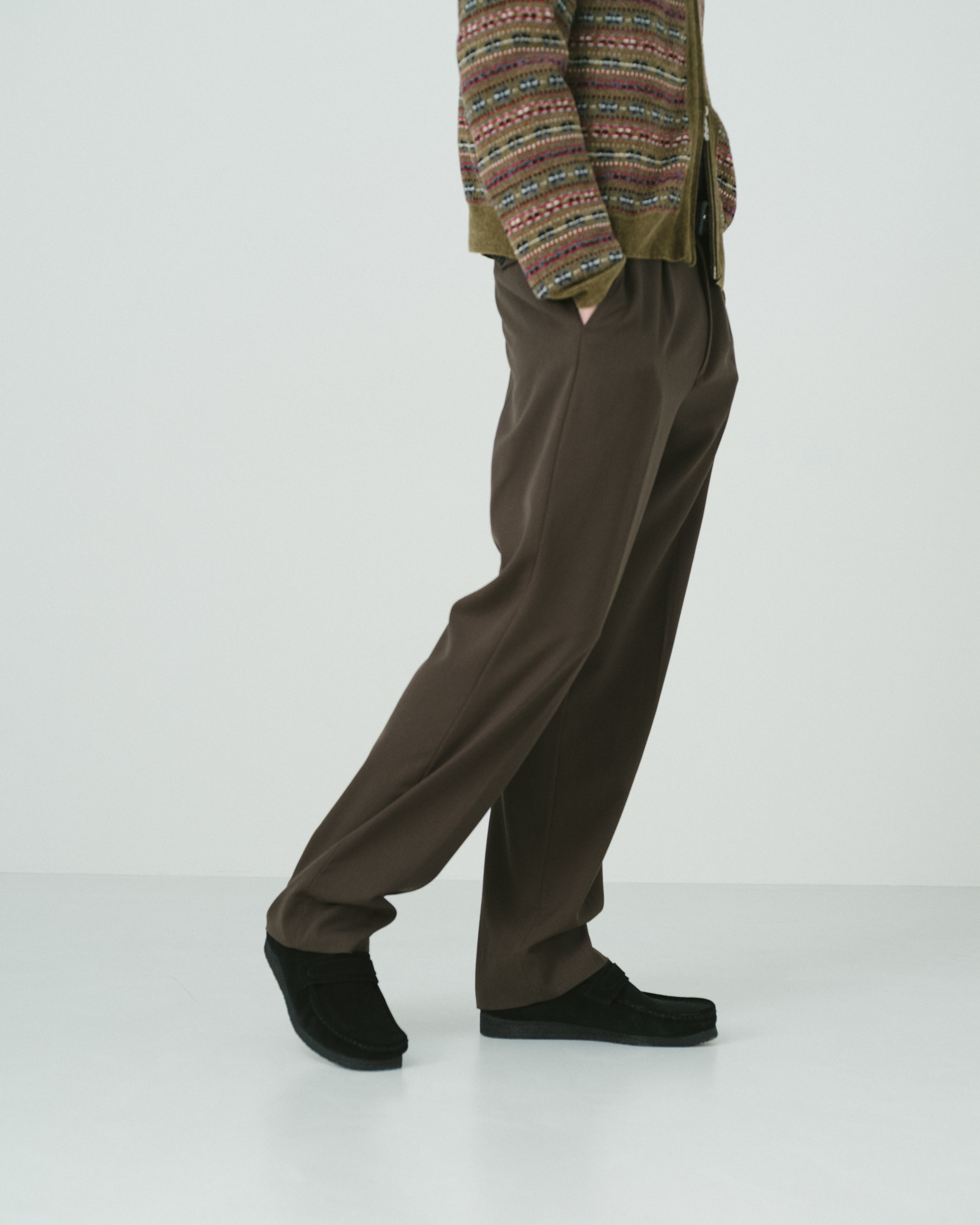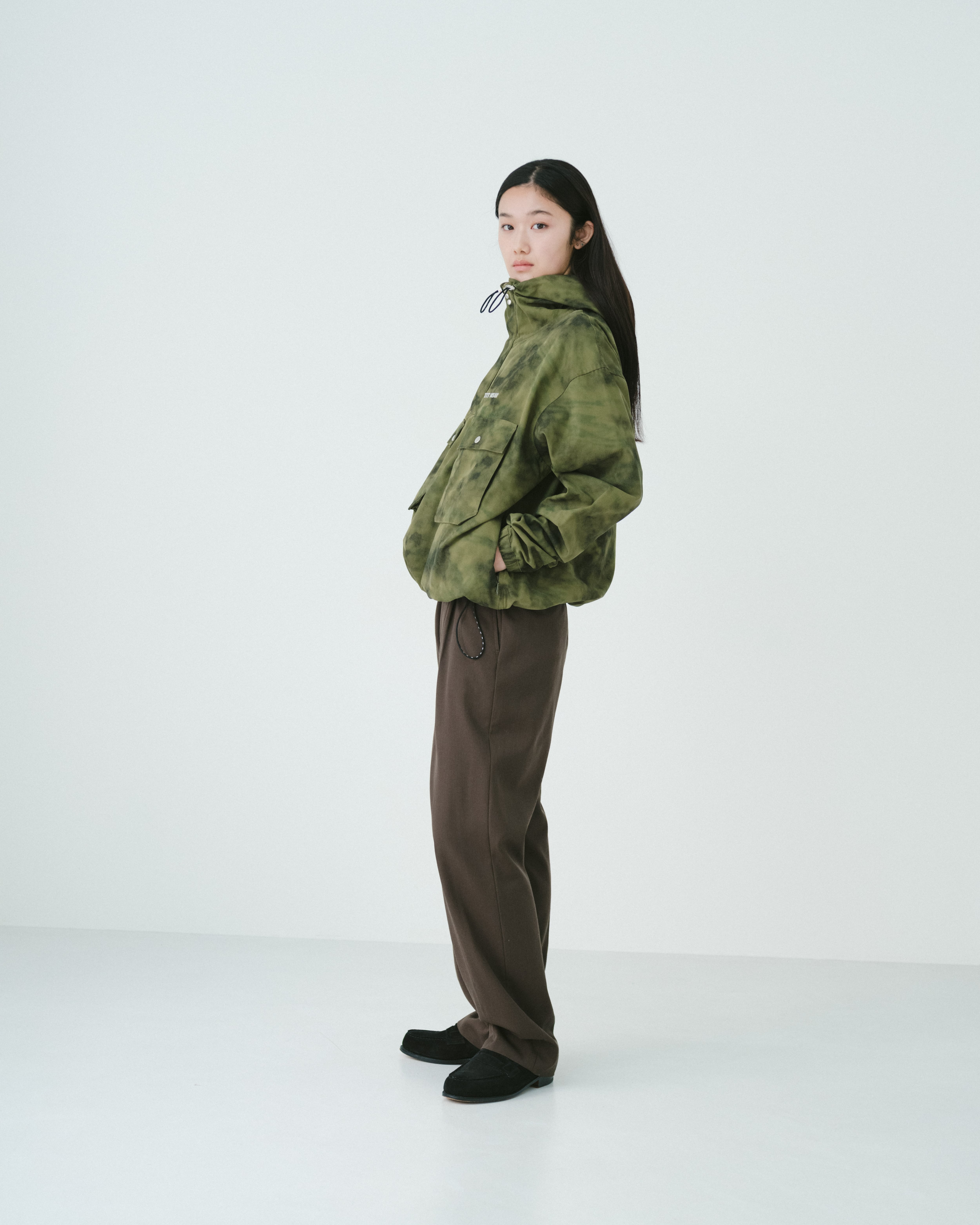メリノウール100のツイル地素材。ヴィスト加工という、特殊溶剤を含侵処理することで、独特なハリ感、落ち感を表現している。