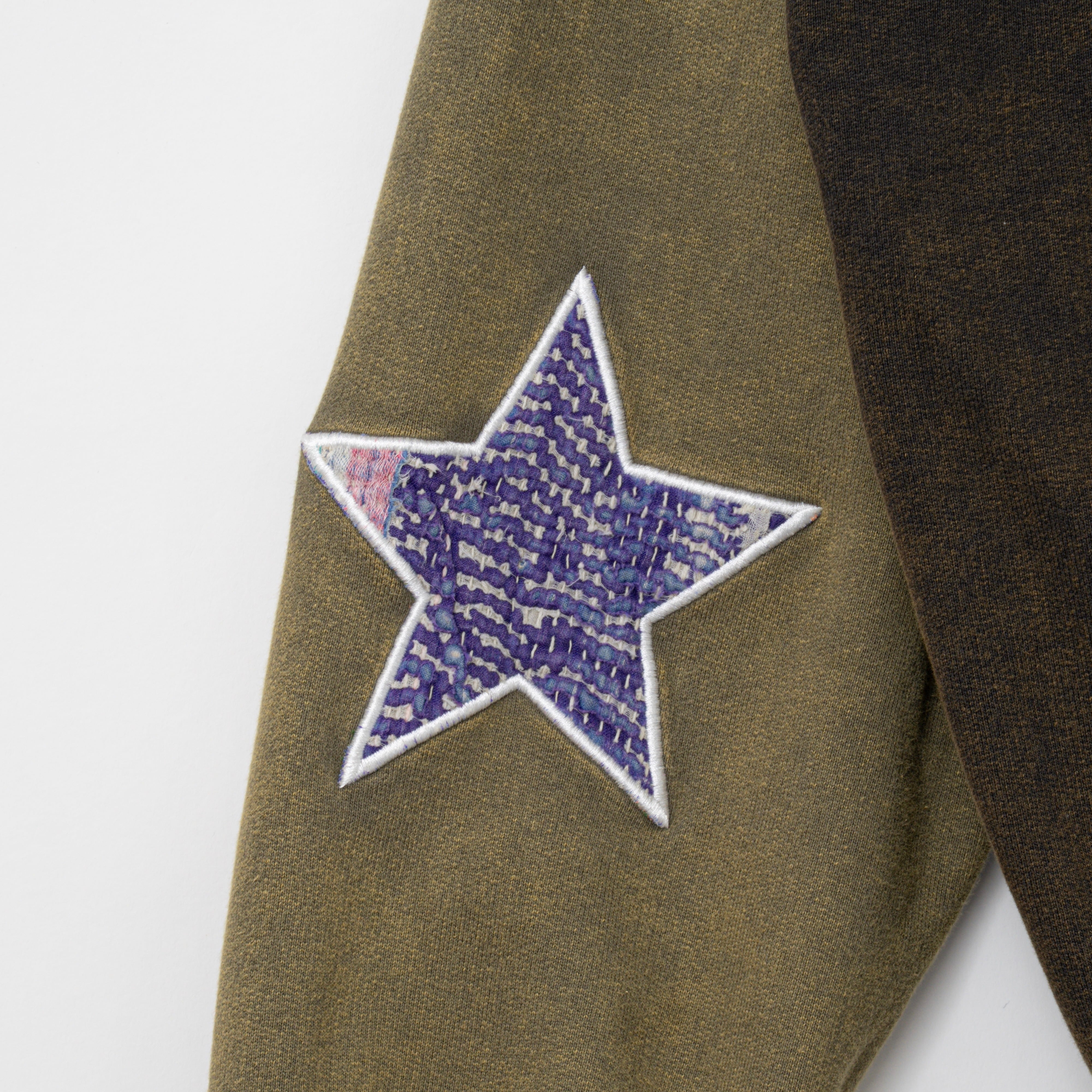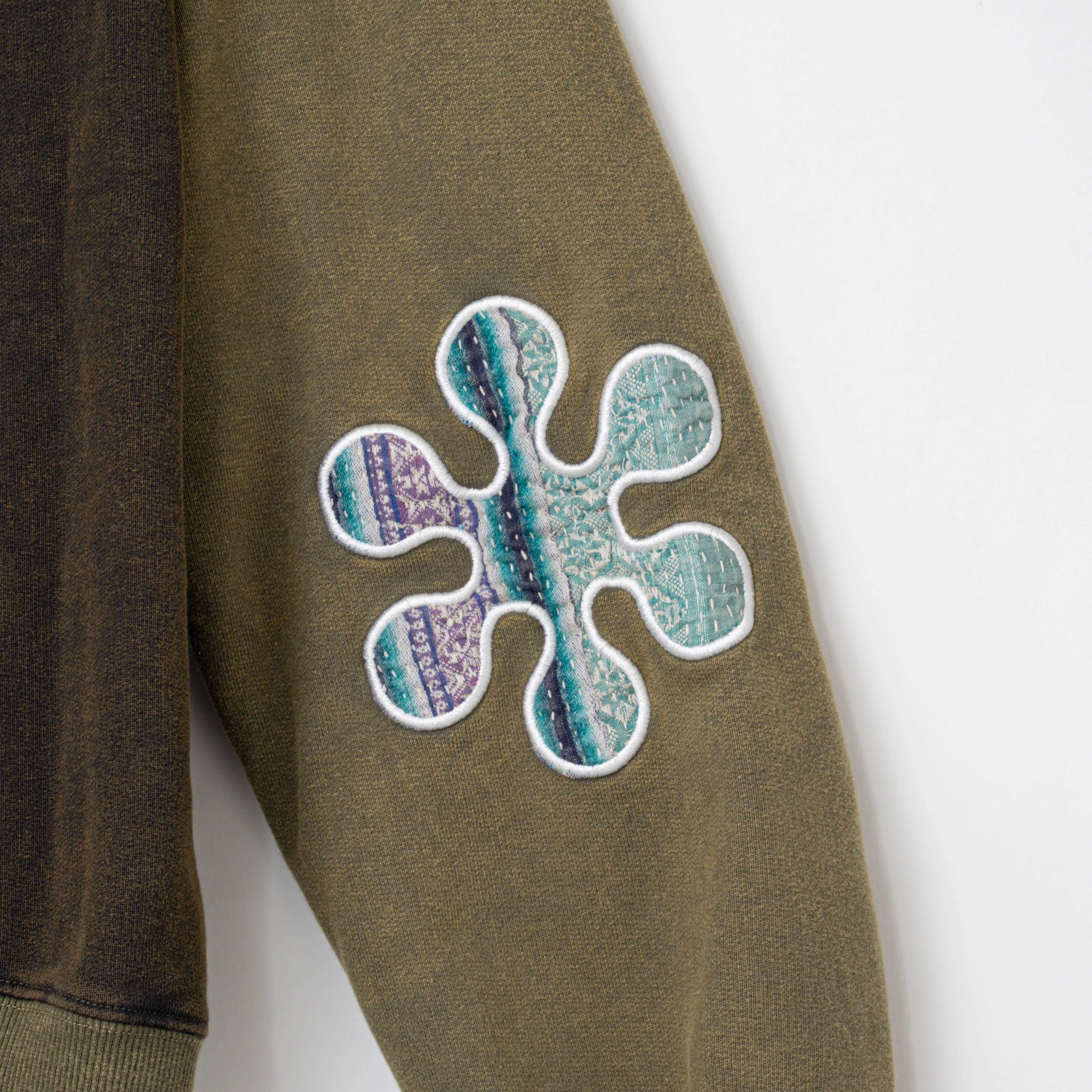 また、エルボーパッチにはをインド・ベンガル地方に伝わる、使い古したサリーなどの古布を重ね合わせ、刺し子刺繍を施したサステナブルな手仕事布の「カンタキルト」を採用。1点ごとにデザインが異なるもポイント。フード裏には、サーマル生地を使用。