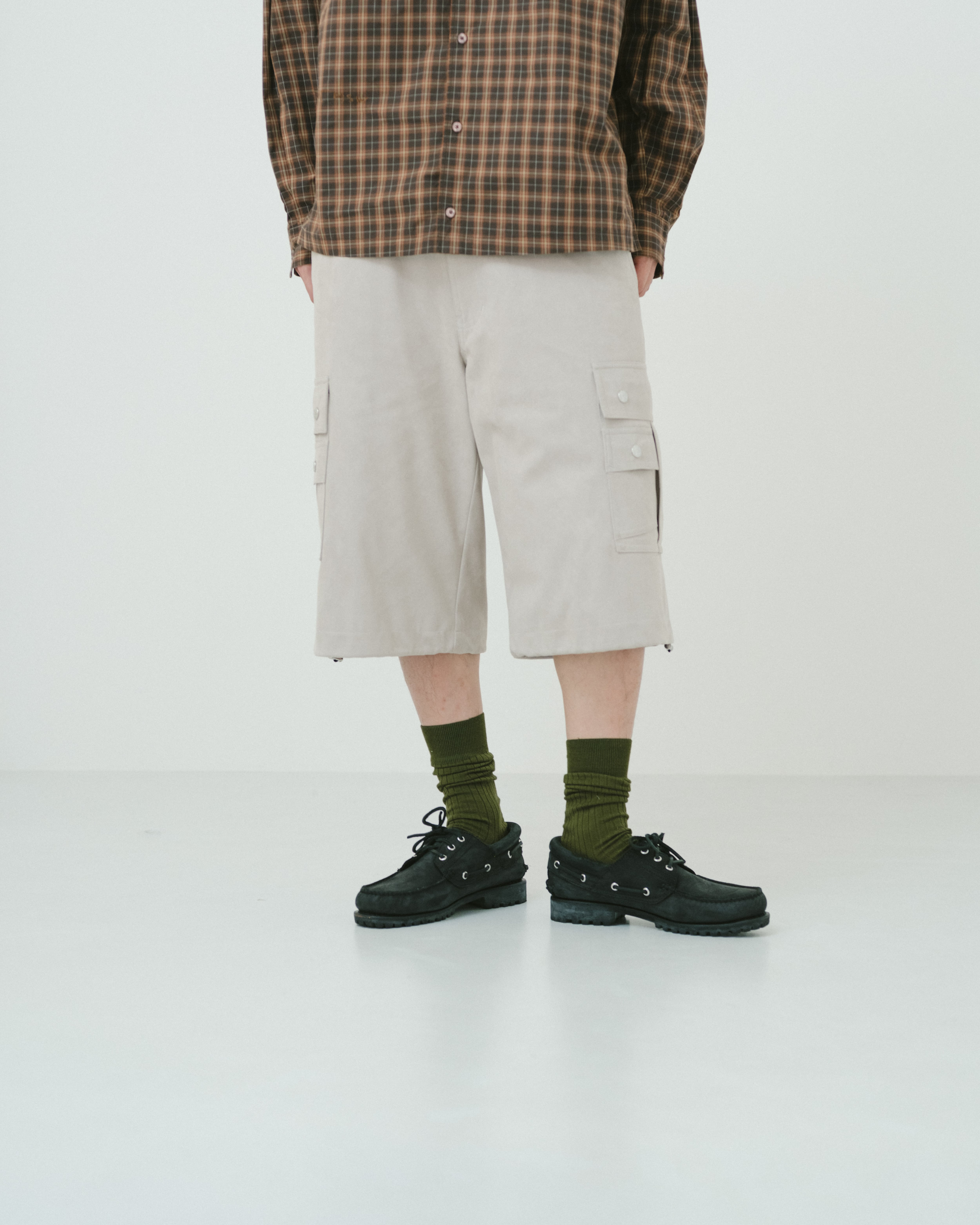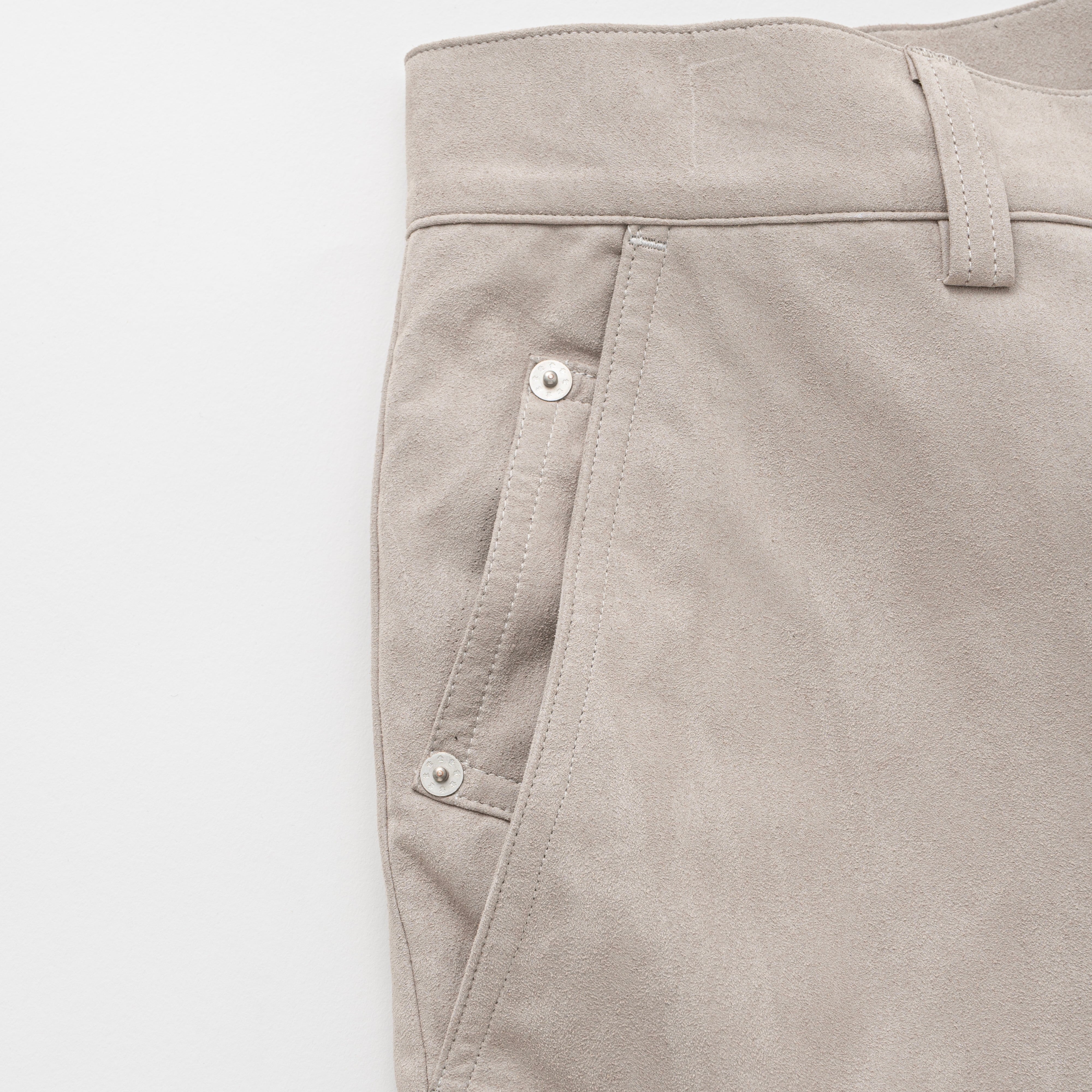 超極細繊維を使用した上質な人口皮革。天然皮革のような柔らかい肌触りを実現しながら、軽量であることが特徴。裾はドローコードで調節可能。