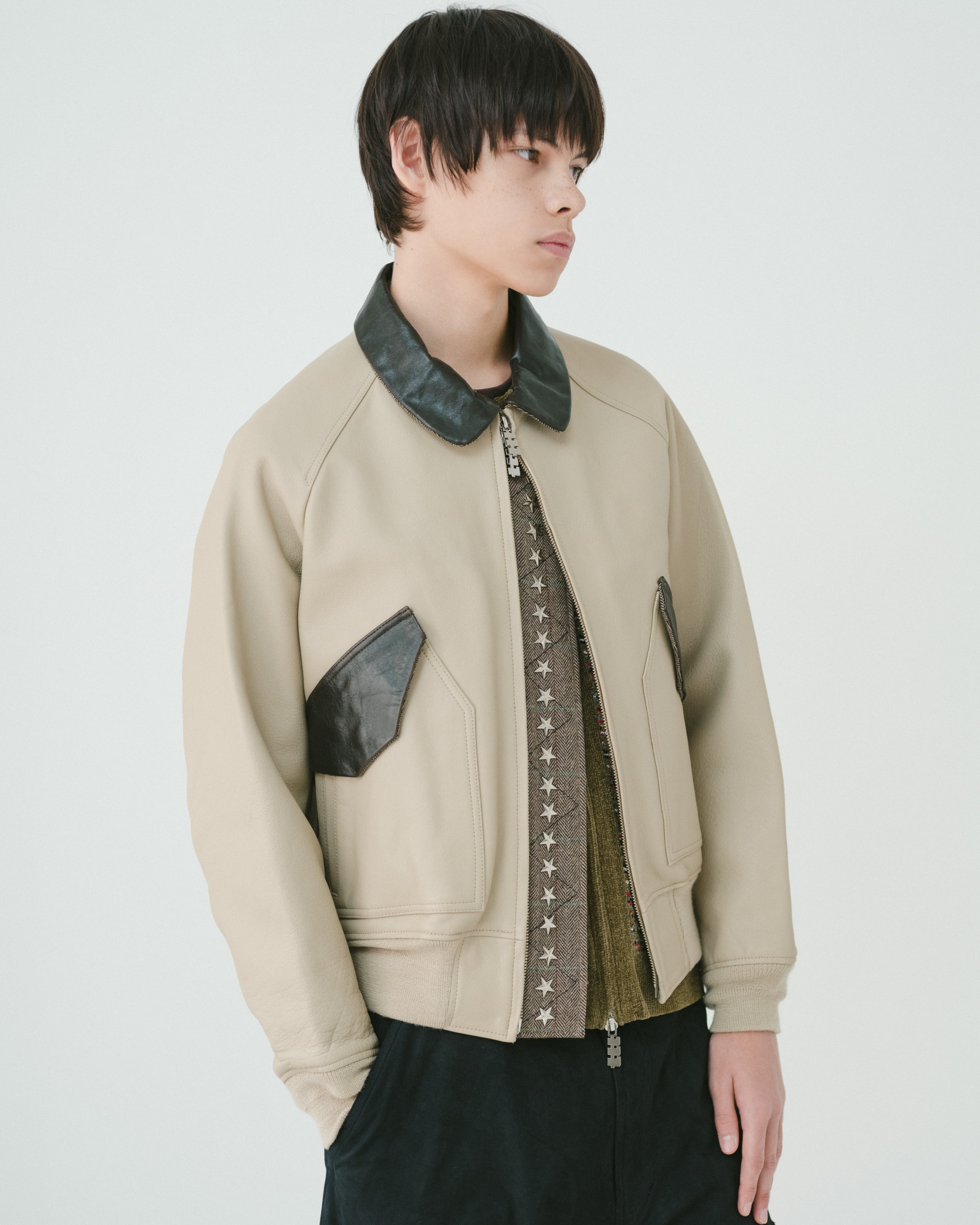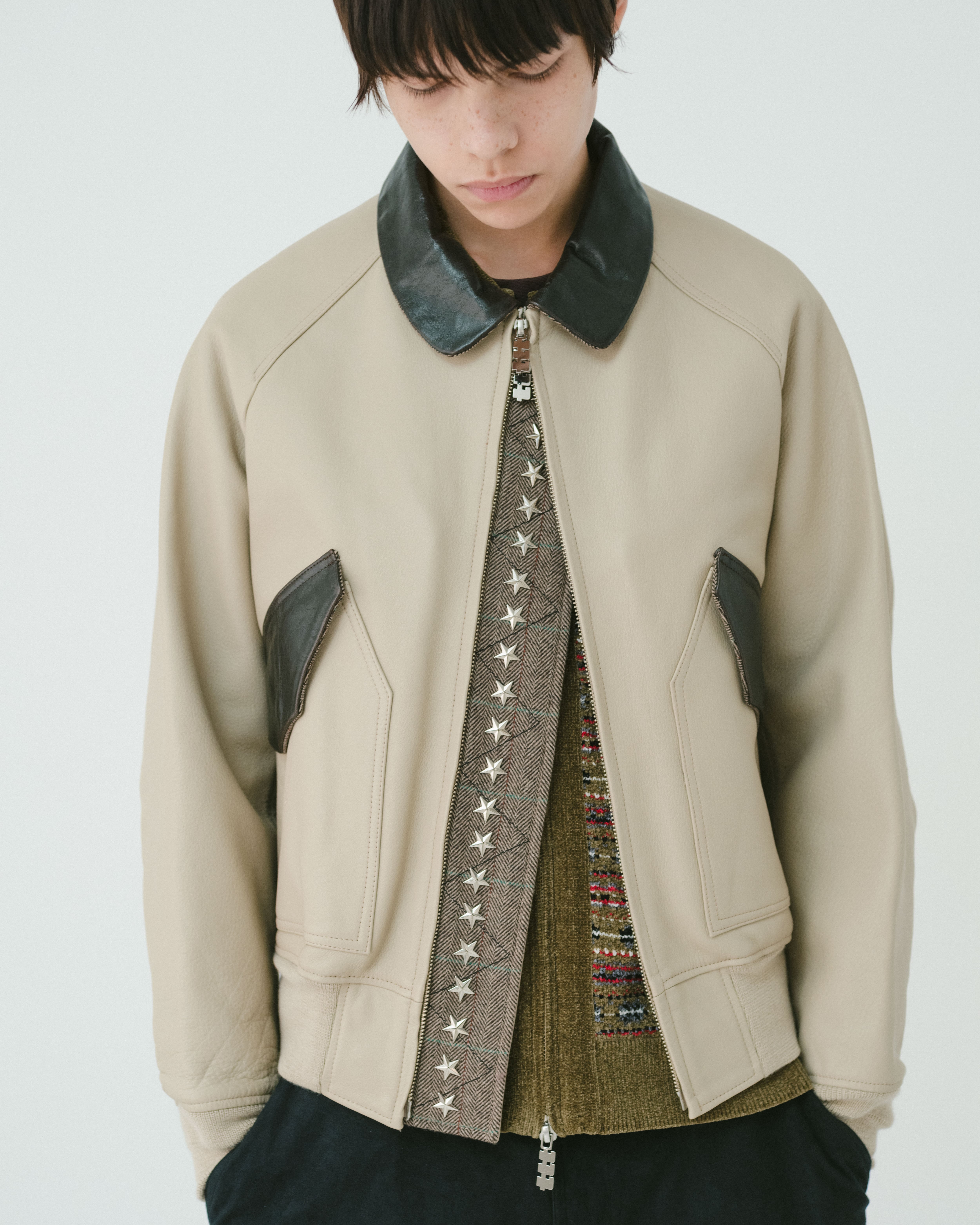 持ち出し部分には、星のスタッズがたっぷりと施されており、ダブルzipからスタッズを覗かせるスタイリングもおすすめ。コンパクトなサイジングもポイント。