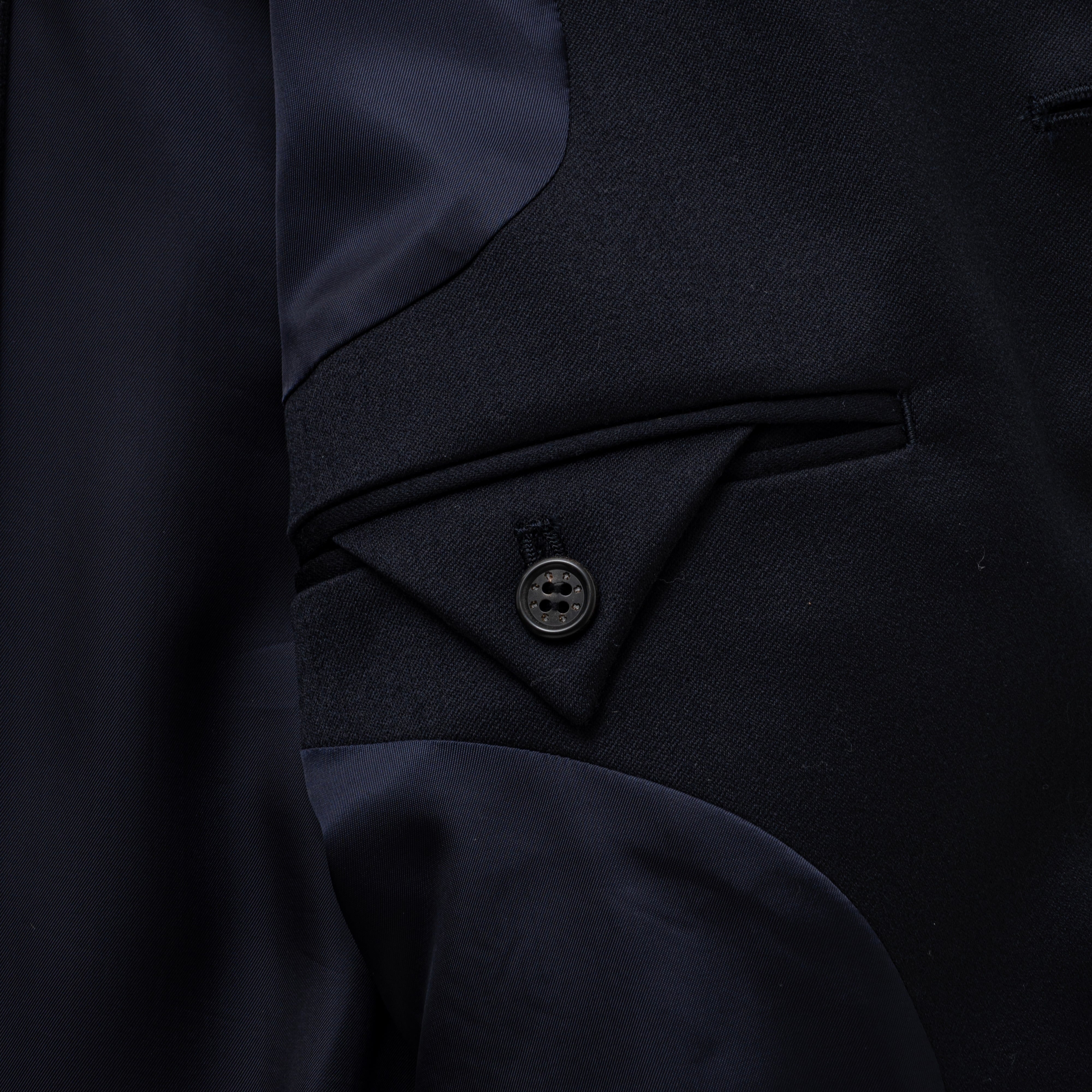 フィラメントのような発色と光沢を持つサテン織物。 軽量だが、ウールの温かみを残した素材感が特徴。ジャケット内側は、台場仕立て(スーツやジャケットの内ポケット周辺を裏地ではなく、表地(共生地)で囲む仕立て方)で縫製する技法を施している。