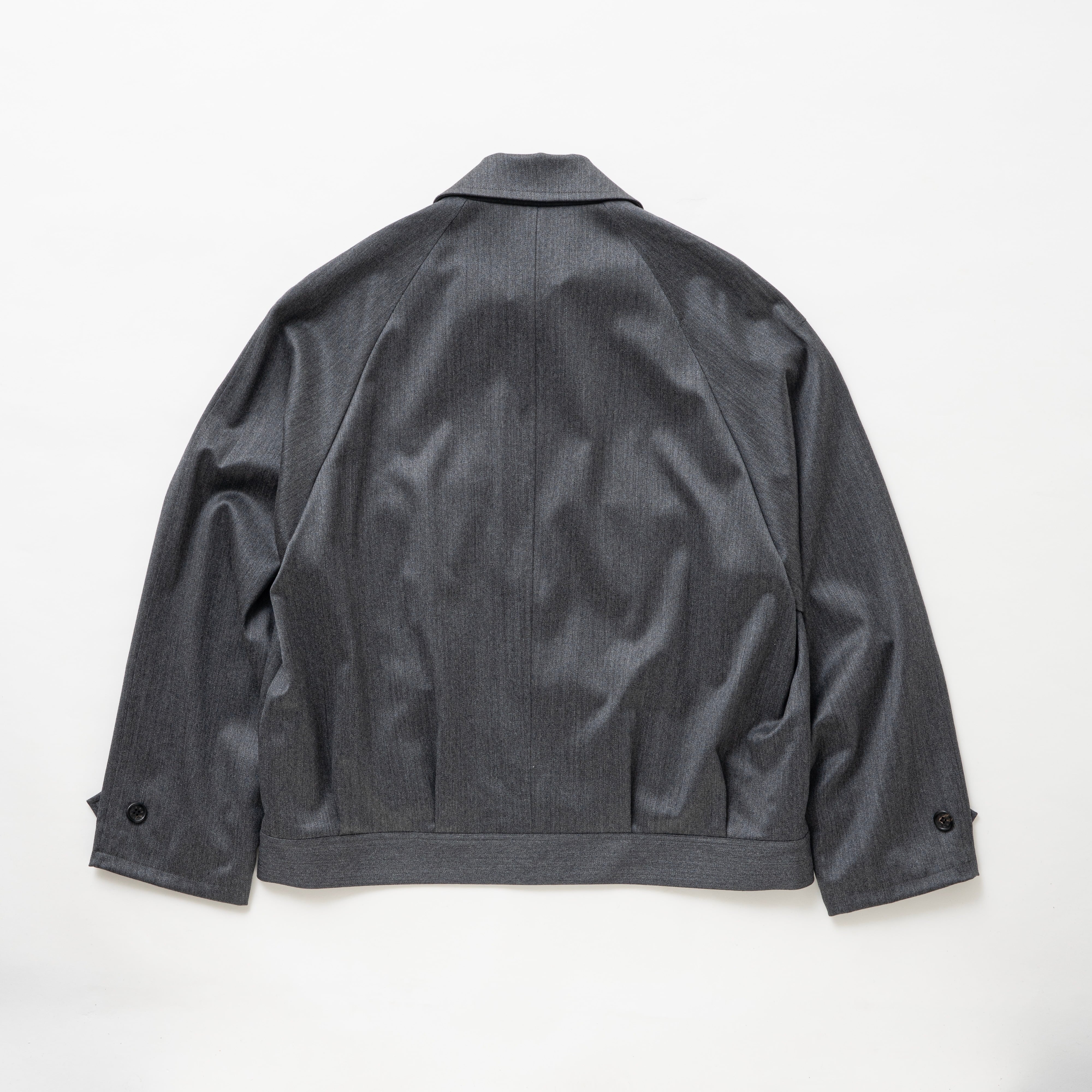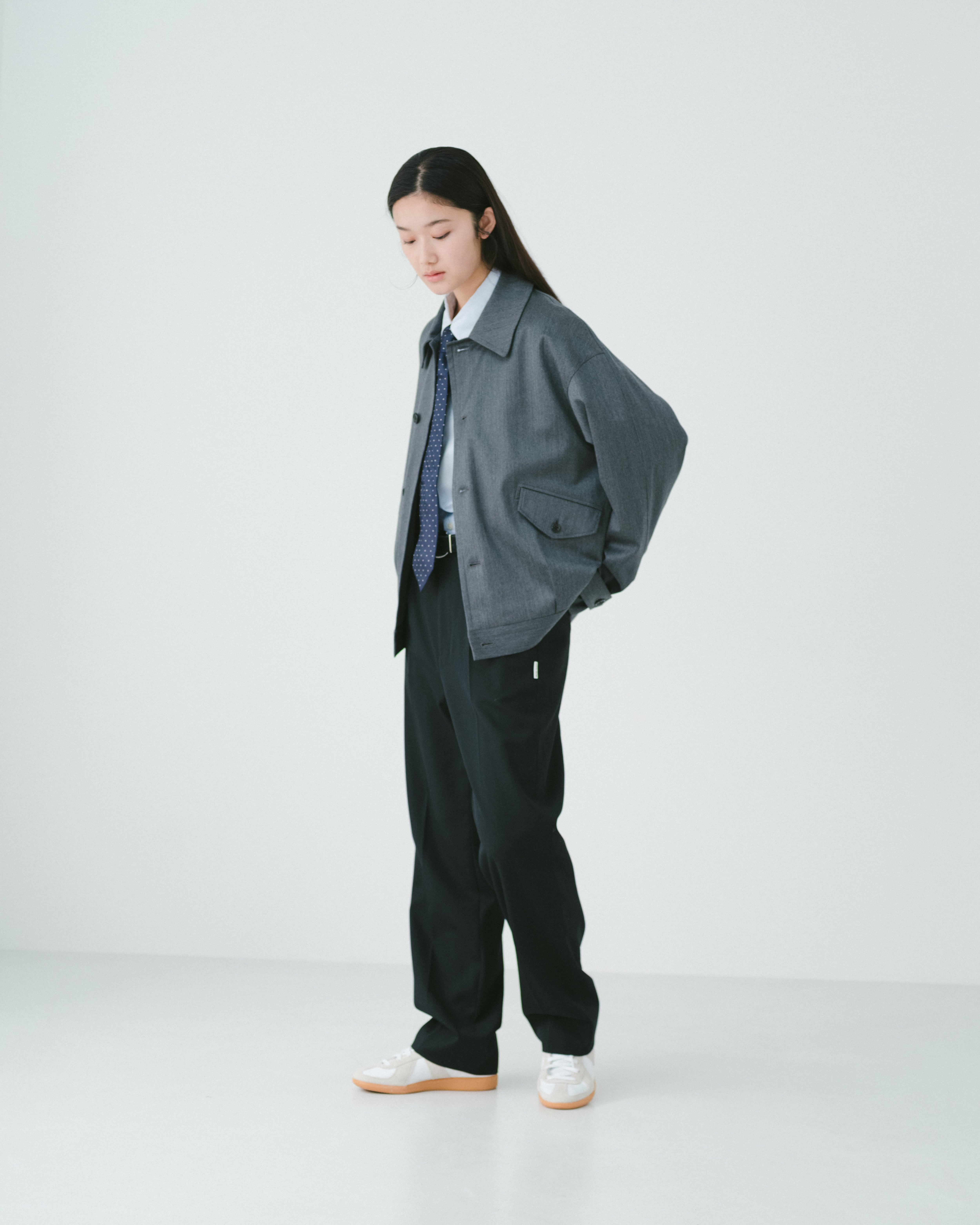 フィラメントのような発色と光沢を持つサテン織物。 軽量だが、ウールの温かみを残した素材感が特徴。ジャケット内側は、台場仕立て(スーツやジャケットの内ポケット周辺を裏地ではなく、表地(共生地)で囲む仕立て方)で縫製する技法を施している。