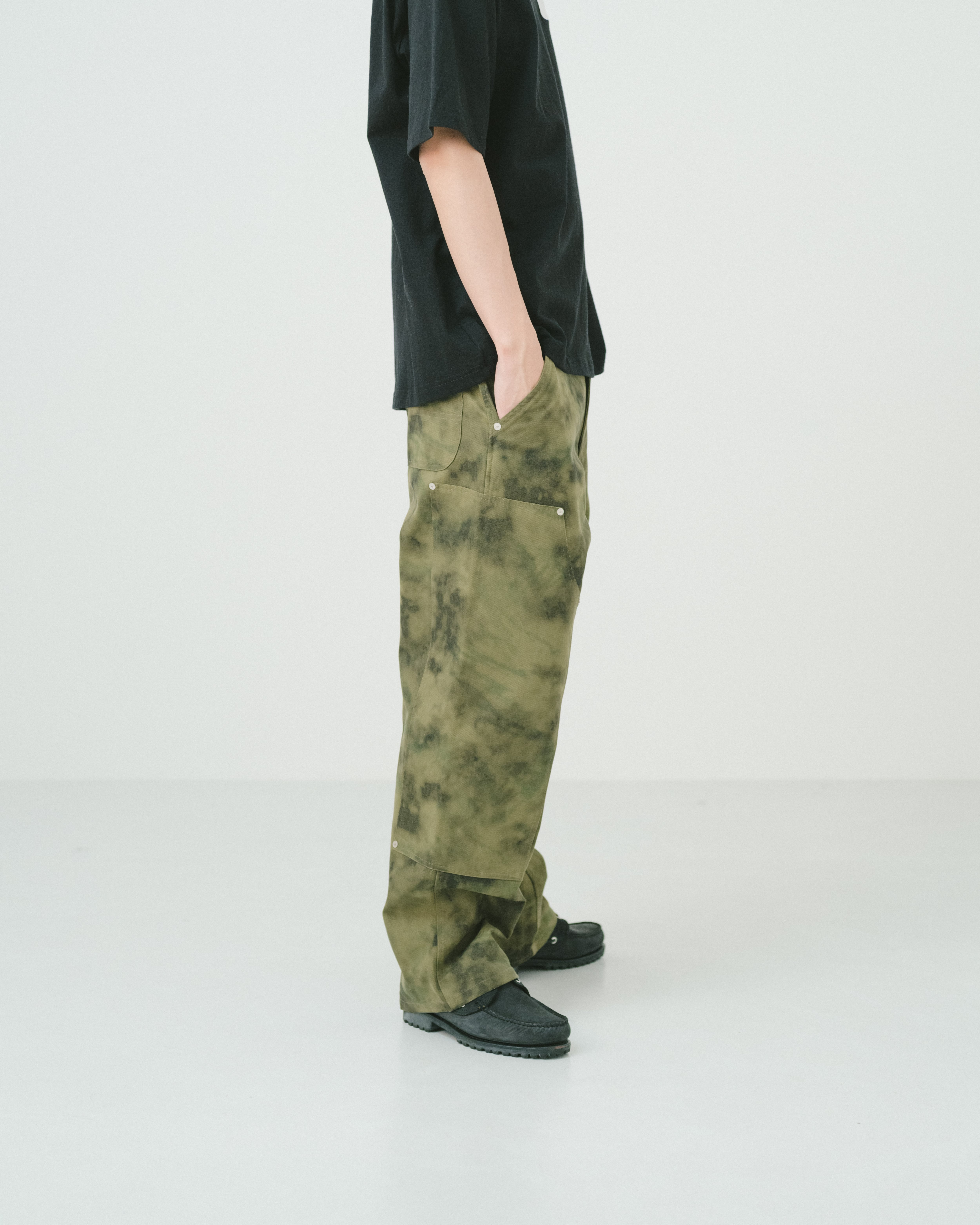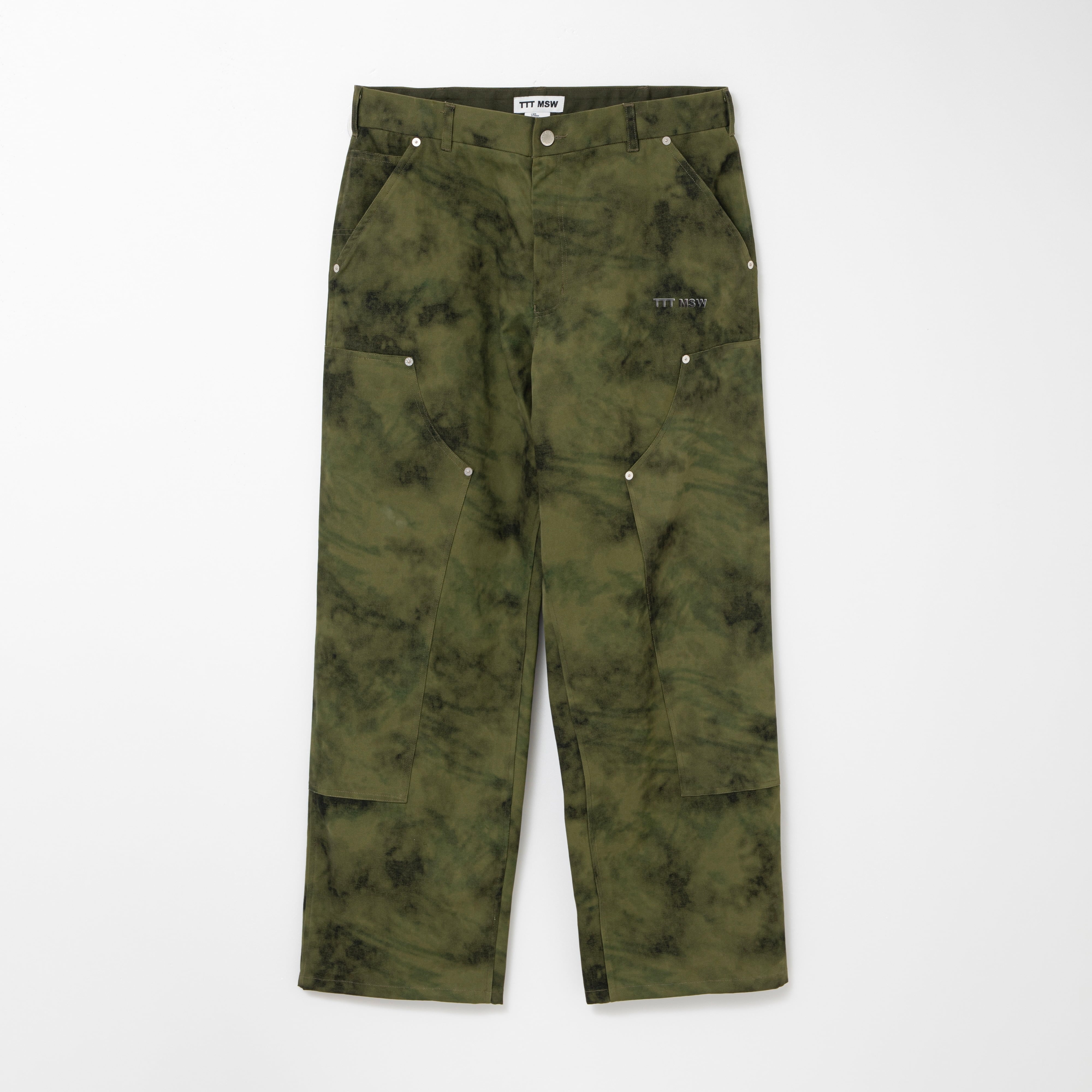 厚手のツイルコットン素材に、製品染め風のムラ感のあるプリントを施した素材。ダブルニーパンツとは、パンツの膝部分に当て生地が施され、二重に補強されたワークパンツの一種。TTTMSWロゴには、メタルプレートを採用。