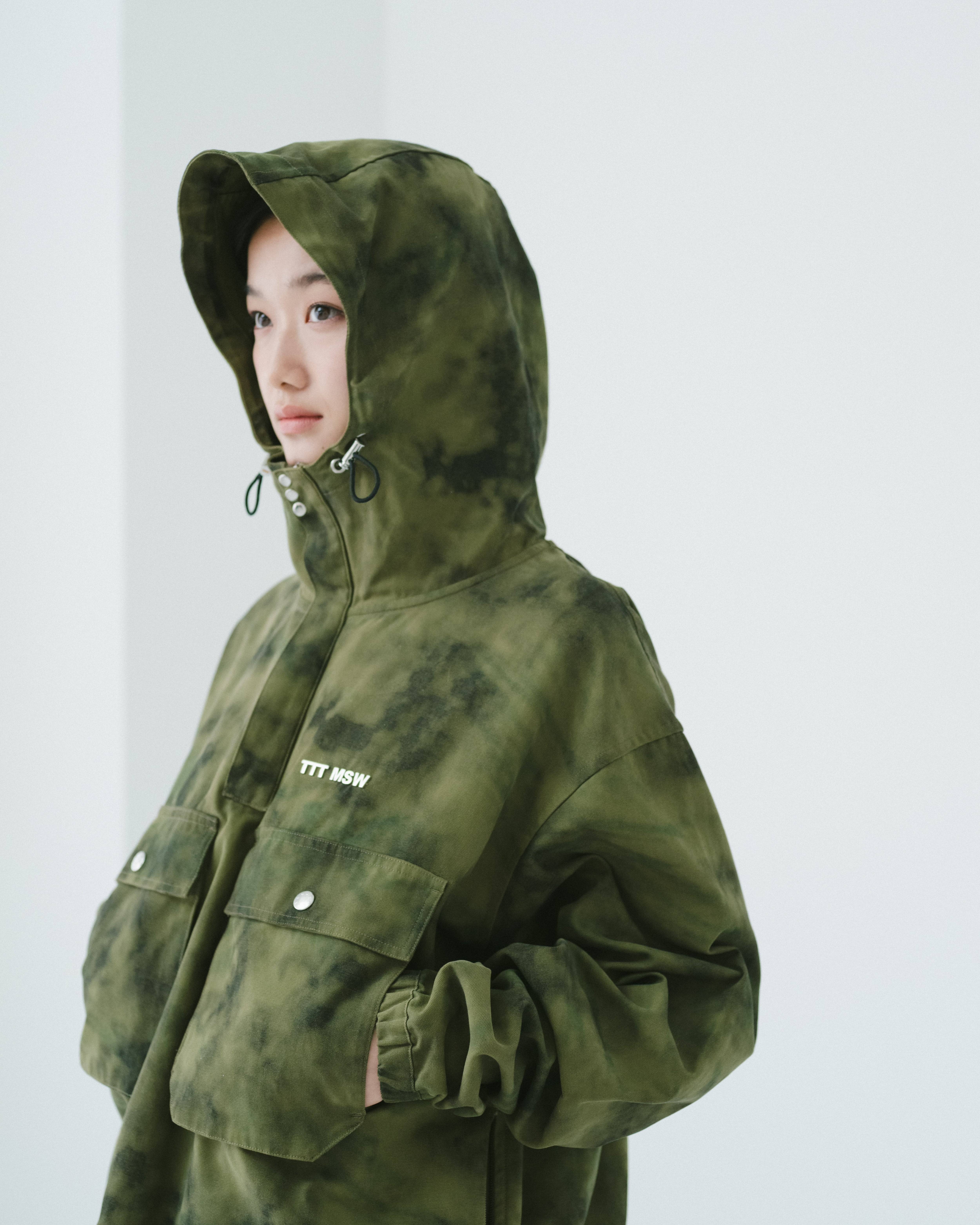 厚手のツイルコットン素材に、製品染め風のムラ感のあるプリントを施した素材。胸元のロゴには、メタルプレートを採用。ボディにはフラップポケットだけではなく、スリットポケットも隠されており、機能面も非常に高い1着。首元や裾は、tttオリジナルドローコードで調節可能。
