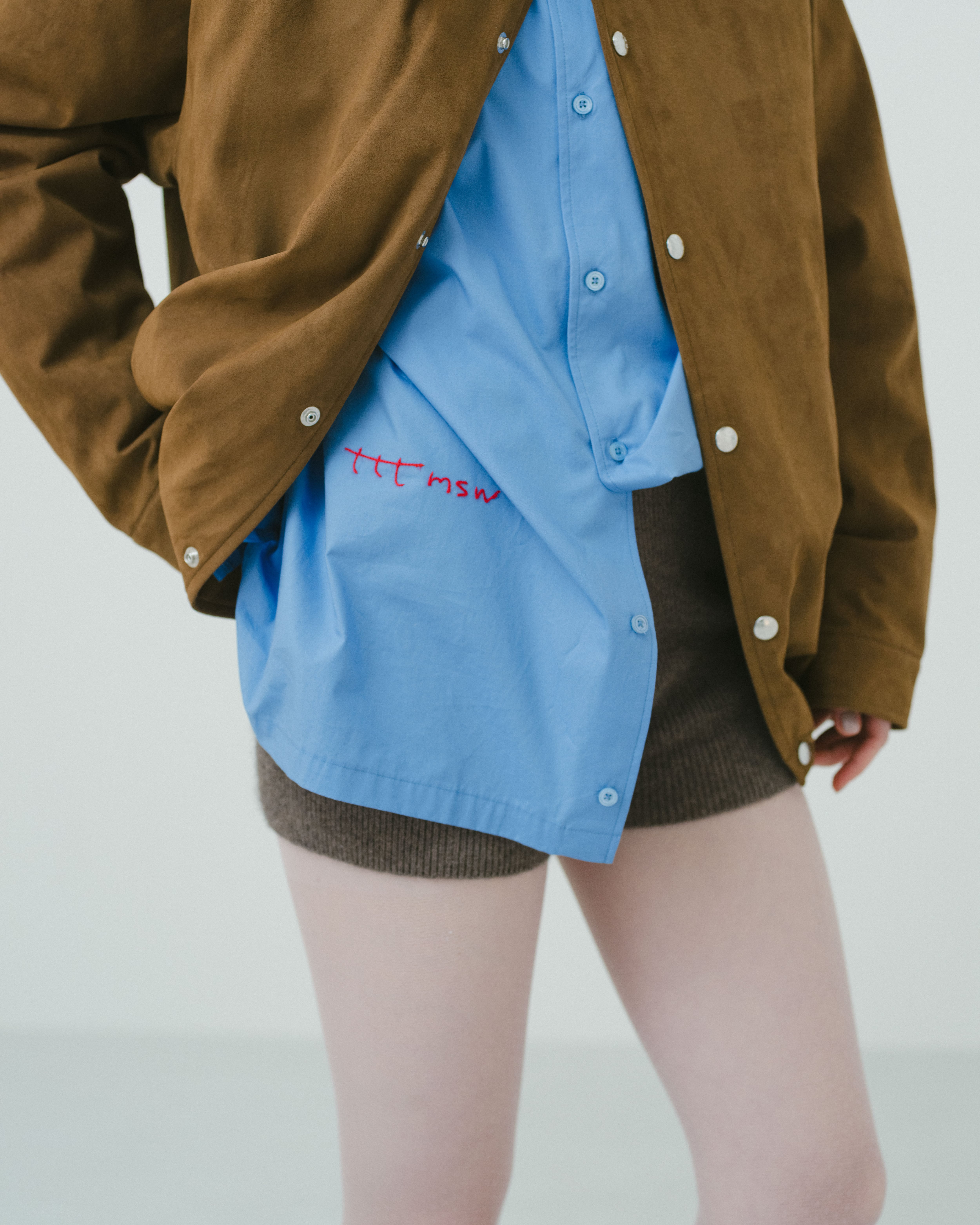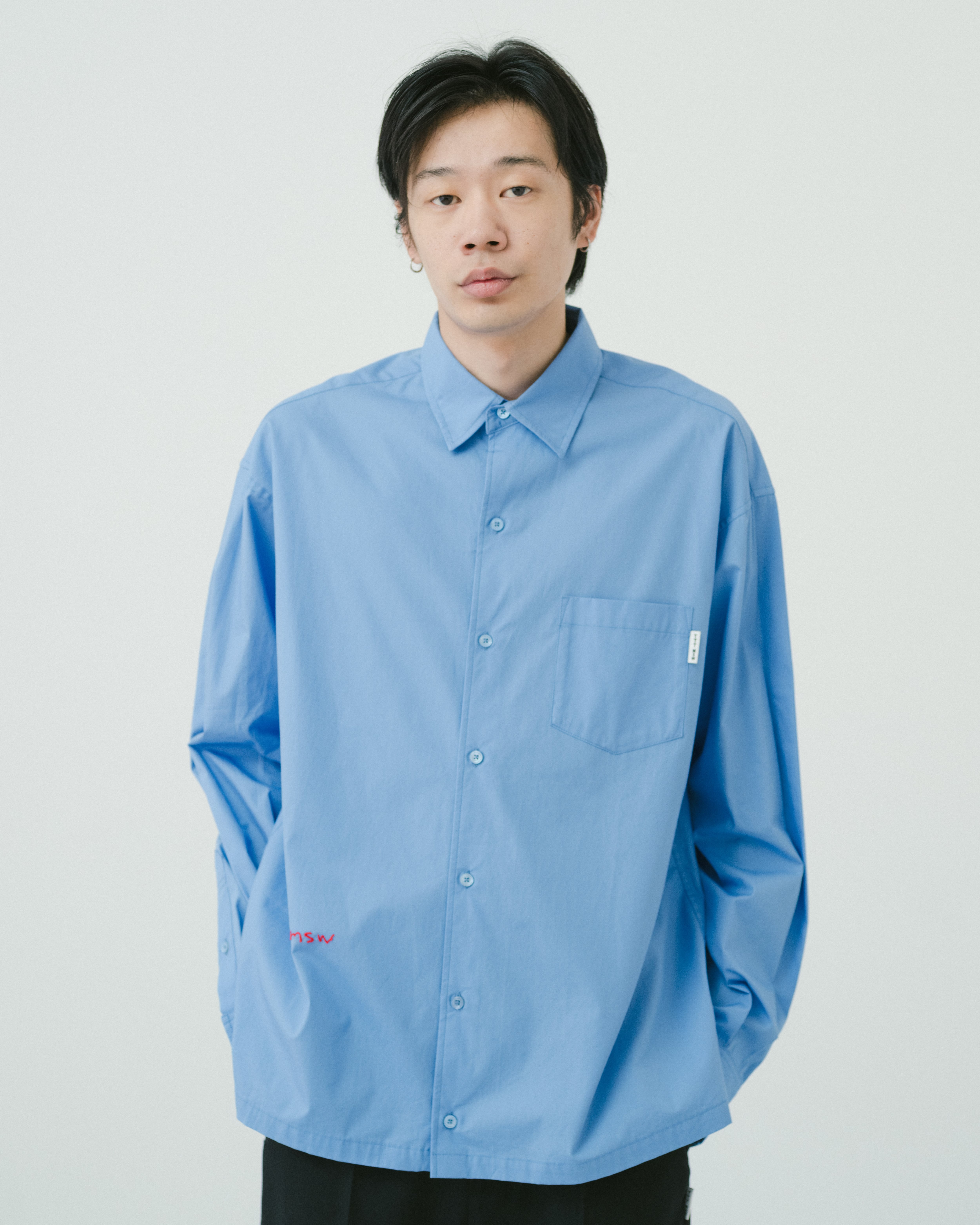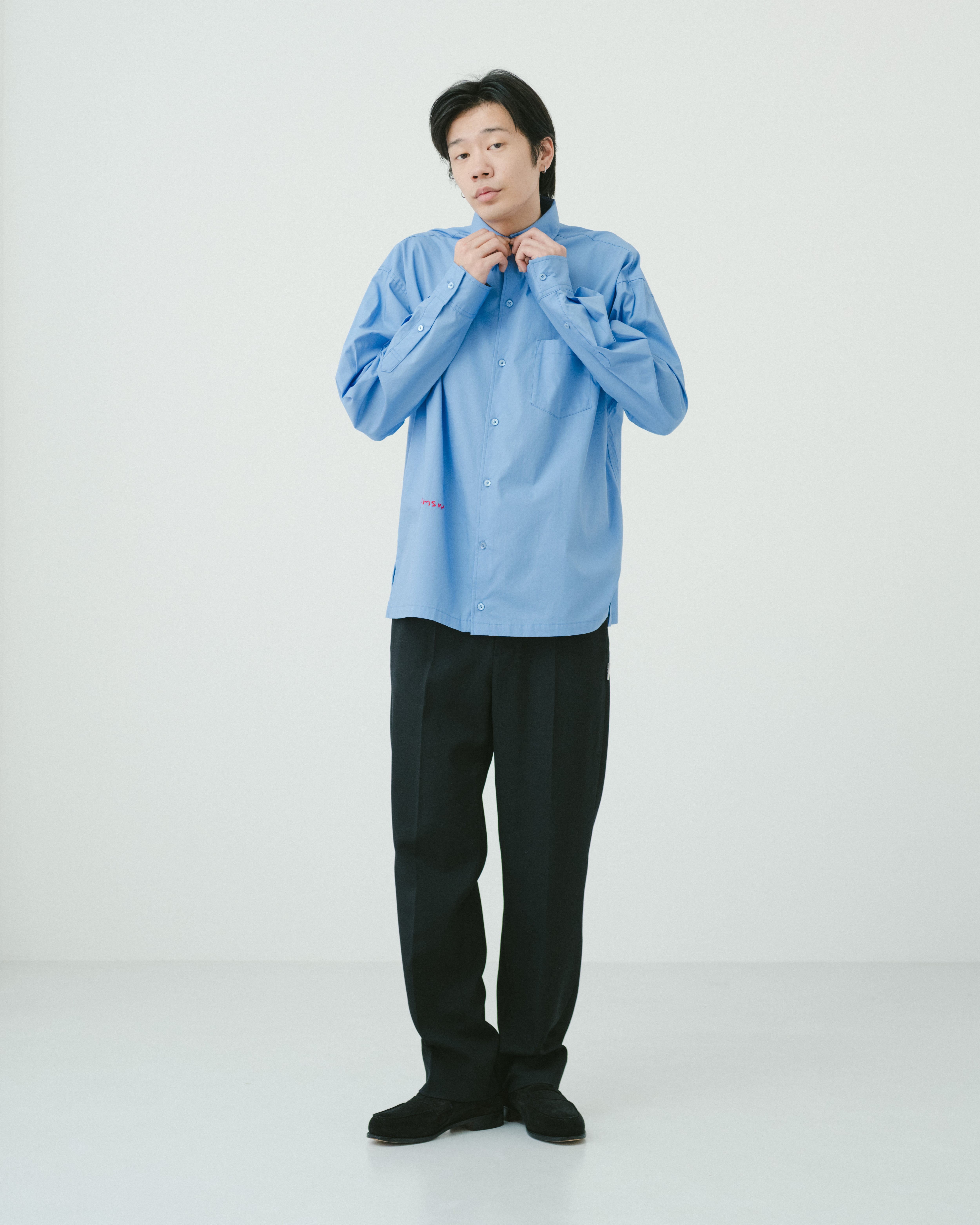 定番デザインのレギュラーカラーシャツだが、手書きデザインのtttロゴ刺繍が、柔らかい印象を与えてくれる1着。